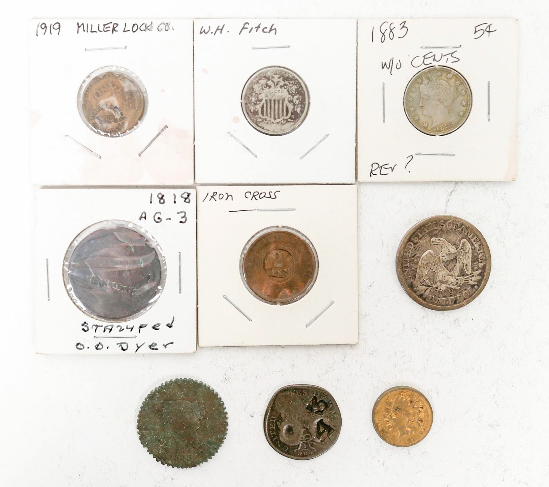 Nine coins that have been stamped: 1) 1865 two cent piece stamped with an Iron Cross. 2) 1853-O Seated Liberty half dollar with arrows, stamped W. S. G. 3) 1808 half cent stamped with 2 6 8. 4) 1818 large cent stamped O.D. Dyer. 5) 1883 no cents Liberty nickel stamped "C". 6) Shield nickel stamped W. H. Fitch. 7) 1845 large cent, serrated edge. 8) 1864 Indian head cent stamped Wm. E. Krewson 1872. 9) 1919 Lincoln cent stamped Miller Lock Company.