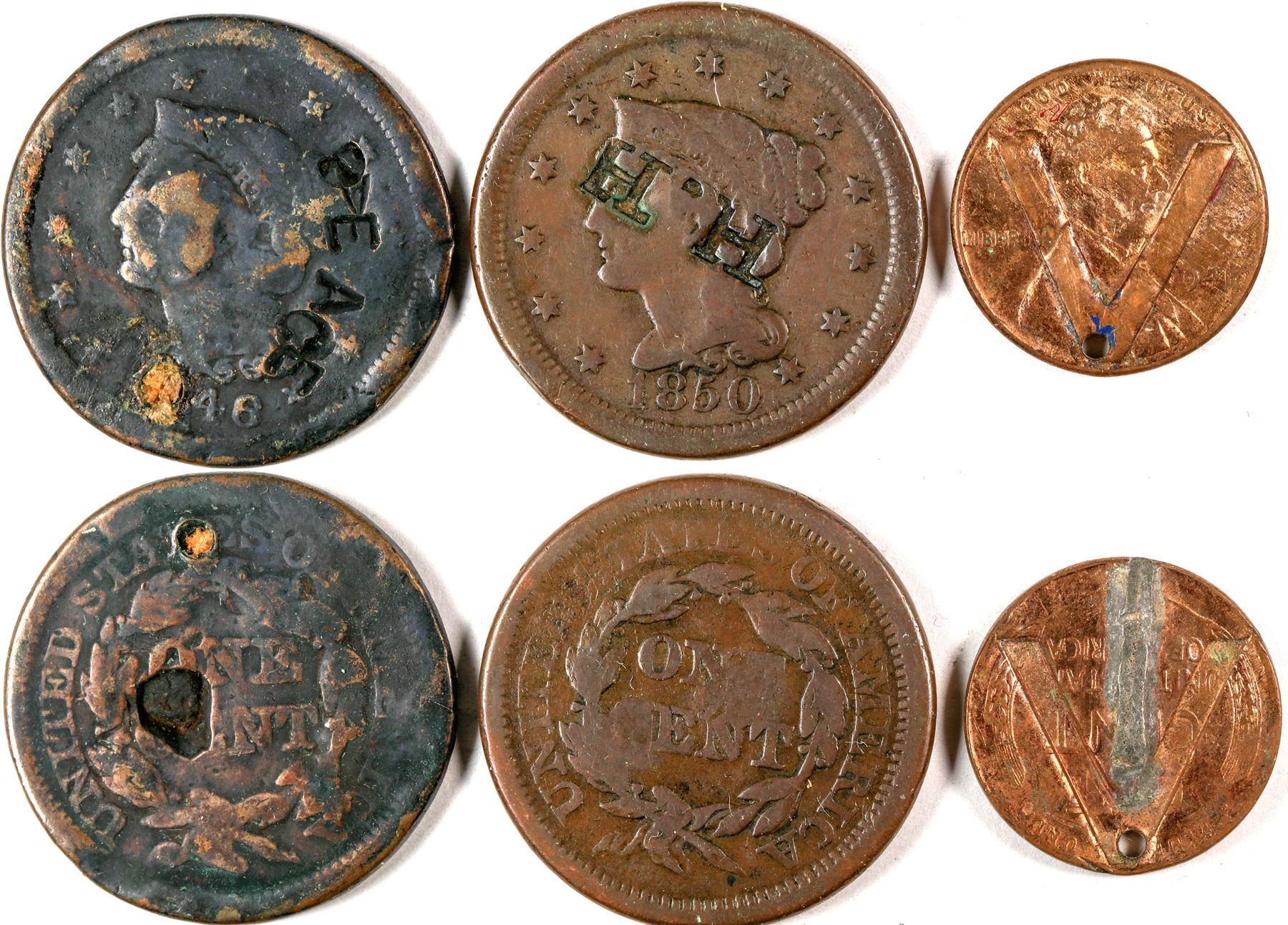 Lot of three: 1) 1850 large cent stamped "H.H."; 2) wheatback cent stamped "V" (WWII victory?); 3) 1846 large cent stamped "PEACE".