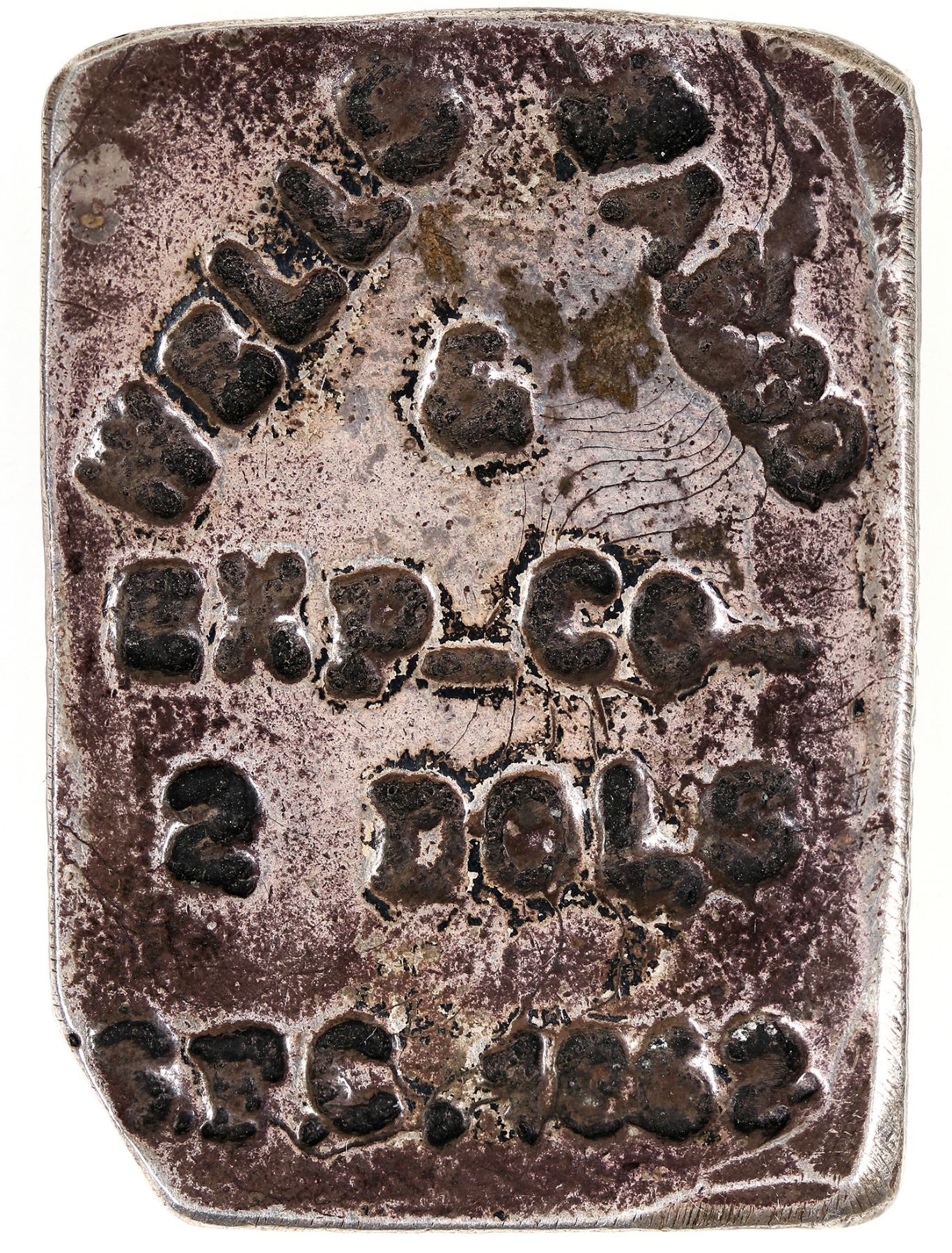 Counterfeit Silver Ingot, stamped Wells Fargo Express & Co.(abbreviated on reverse). According to legend, there were several of these produced. They were made to appear antique and original, with stampings and signs replicated to look authentic. This is not real, despite the realistic appearances. Measures 1.125" x 1.875", weighs 1 oz. The reverse is stamped "2 DOLS/ G.F.C. 1862." Please inspect.