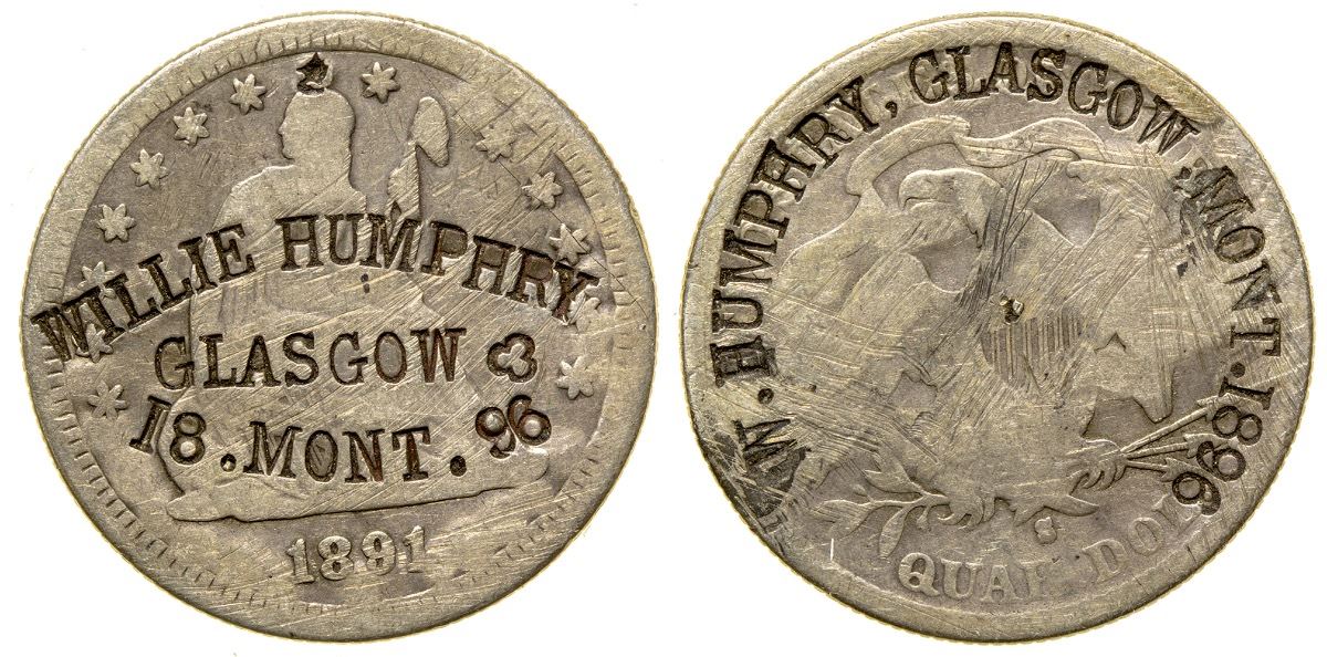 An 1891-S seated liberty quarter counterstamped. Obverse: Willie Humphry / Glasgow/ 18.Mont.96; reverse: W. Humphry Glasgow Mont. 1896. (Svoboda Collection) City: Glasgow State: Montana Date: 1891 HWAC# 35105