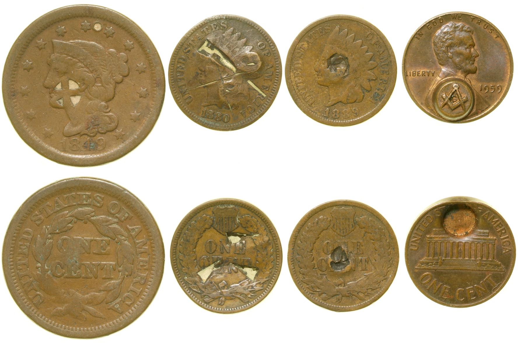 1.) 1959 penny 2.) TWO Indian head penny's 3.) Matron Head & Braided hair 1849 One Cent. City: State: Date: