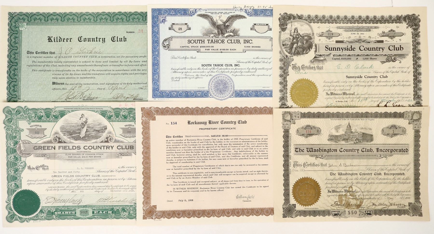 A group of six stock certificates from various country clubs, dating from 1909 to 1929. The issuing clubs are the Rockaway River Country Club, South Tahoe Club Inc., Washington Country Club Incorporated, Sunnyside Country Club, Kildeer Country Club, and Green Fields Country Club. All but one are issued, and of those issued, all bear an embossed company seal. Four are signed by the secretary and president of their respective companies. All are uncancelled and in good condition.