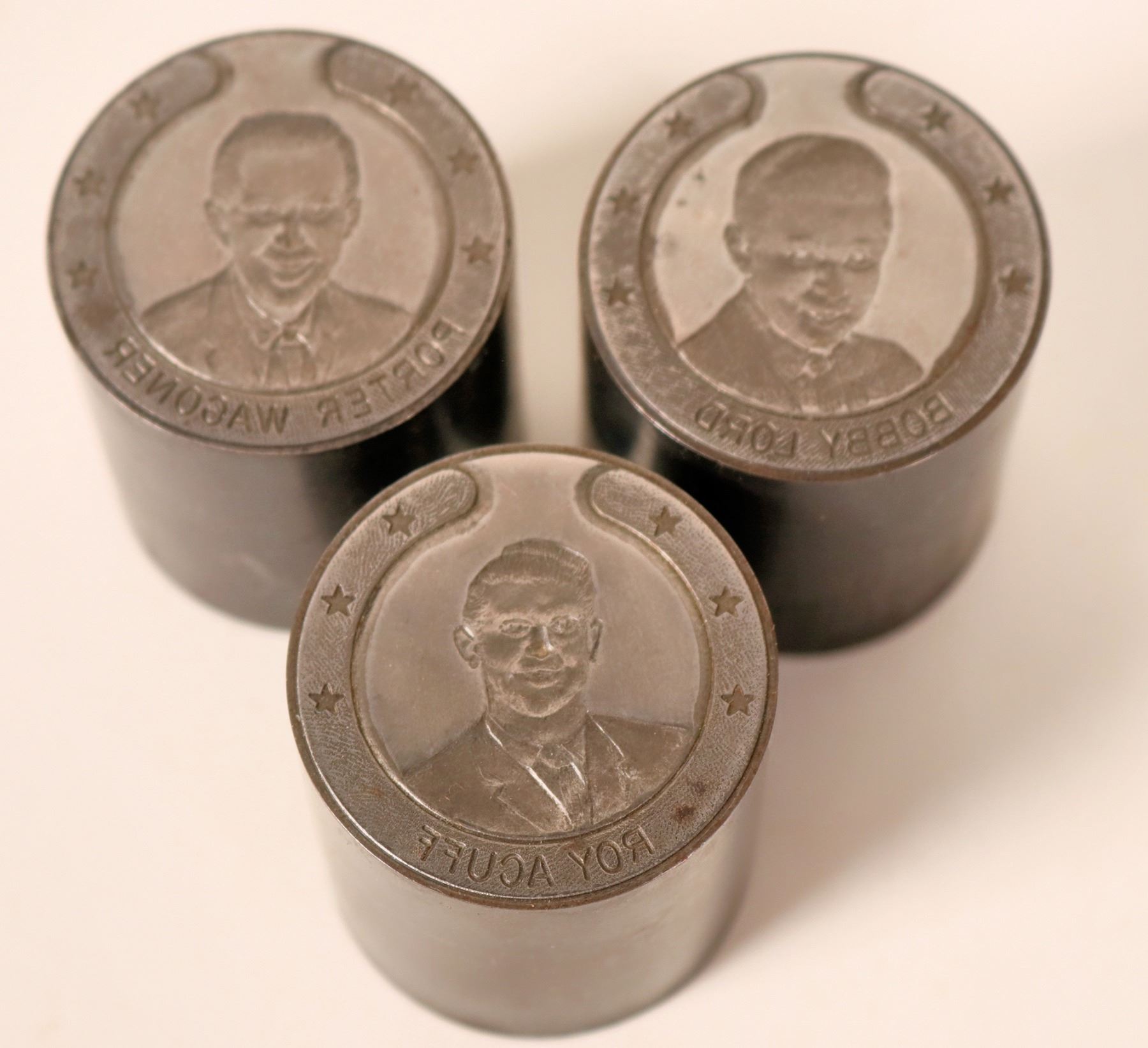 Three dollar sized dies From the Northwest Territorial Mint Historical Die Collection. Roy Acuff, Porter Wagoner, Bobby Lord. probably for a country music commemorative medal series.