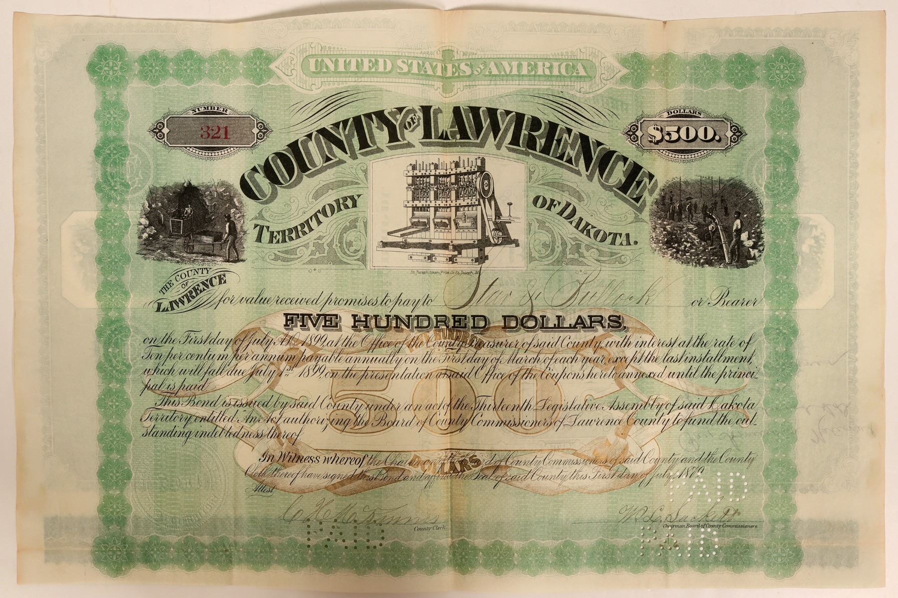 This is one of the great looking bonds. Black on green with a black on white stamp mill vignette. Two other vignettes show ore carts in an underground mining scene and placer mining. # 321 issued to Star & Bullock. No coupons attached.