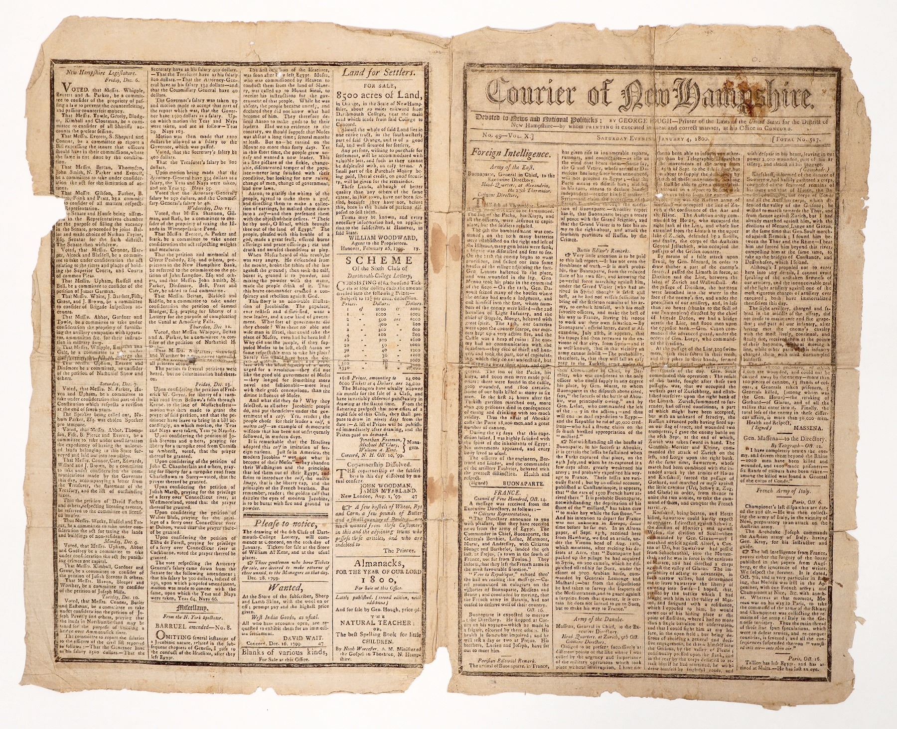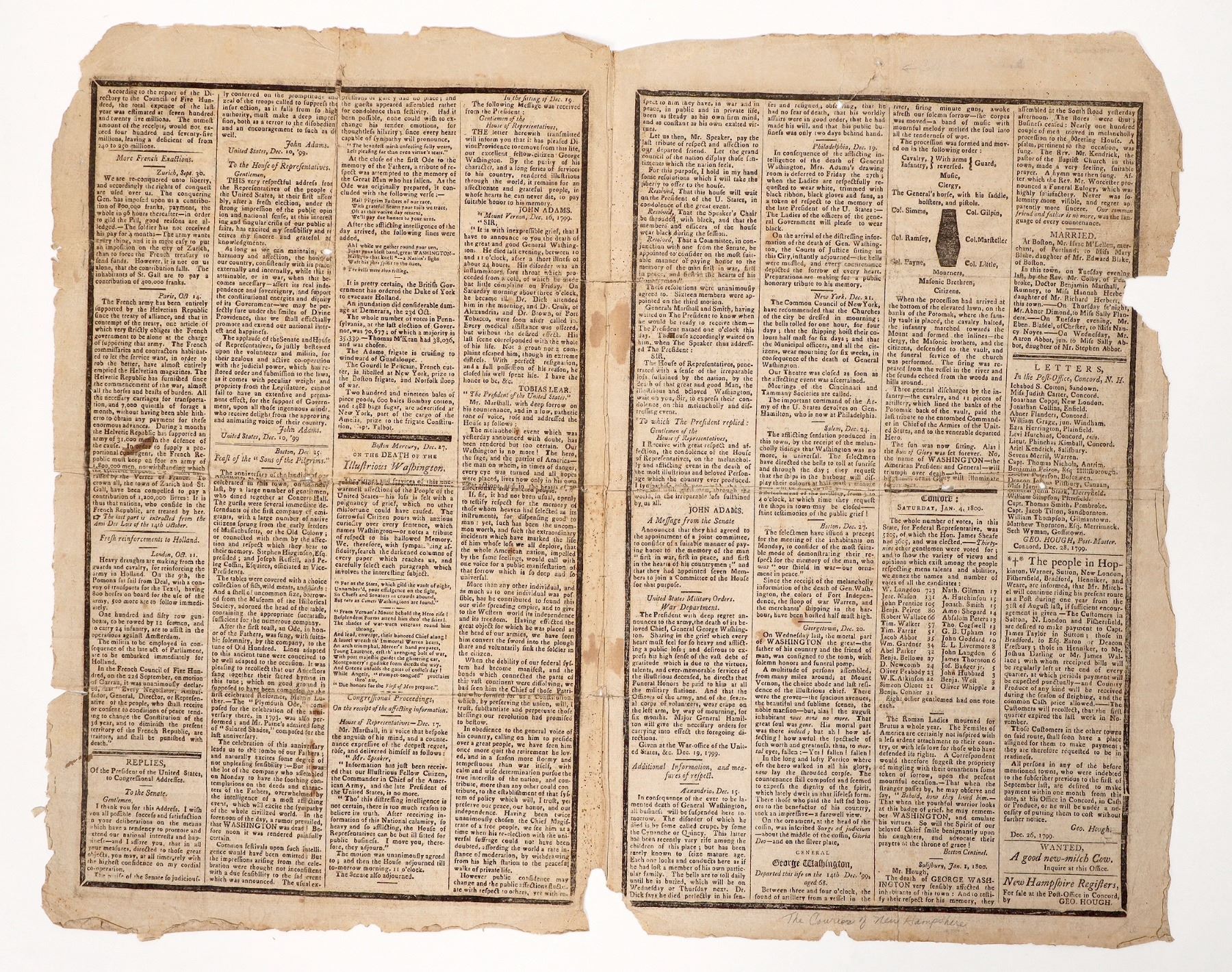 Jan 4, 1800, 4 black bordered pages with 2 inside pages with long detailed news of the death of George Washington and his funeral. On the evening of December 14, 1799, at Mount Vernon, George Washington passed away of a throat infection. He was buried four days later in the family vault at Mount Vernon as per his instructions, not to be buried before 3 days. Small stain and edge chips, please inspect.