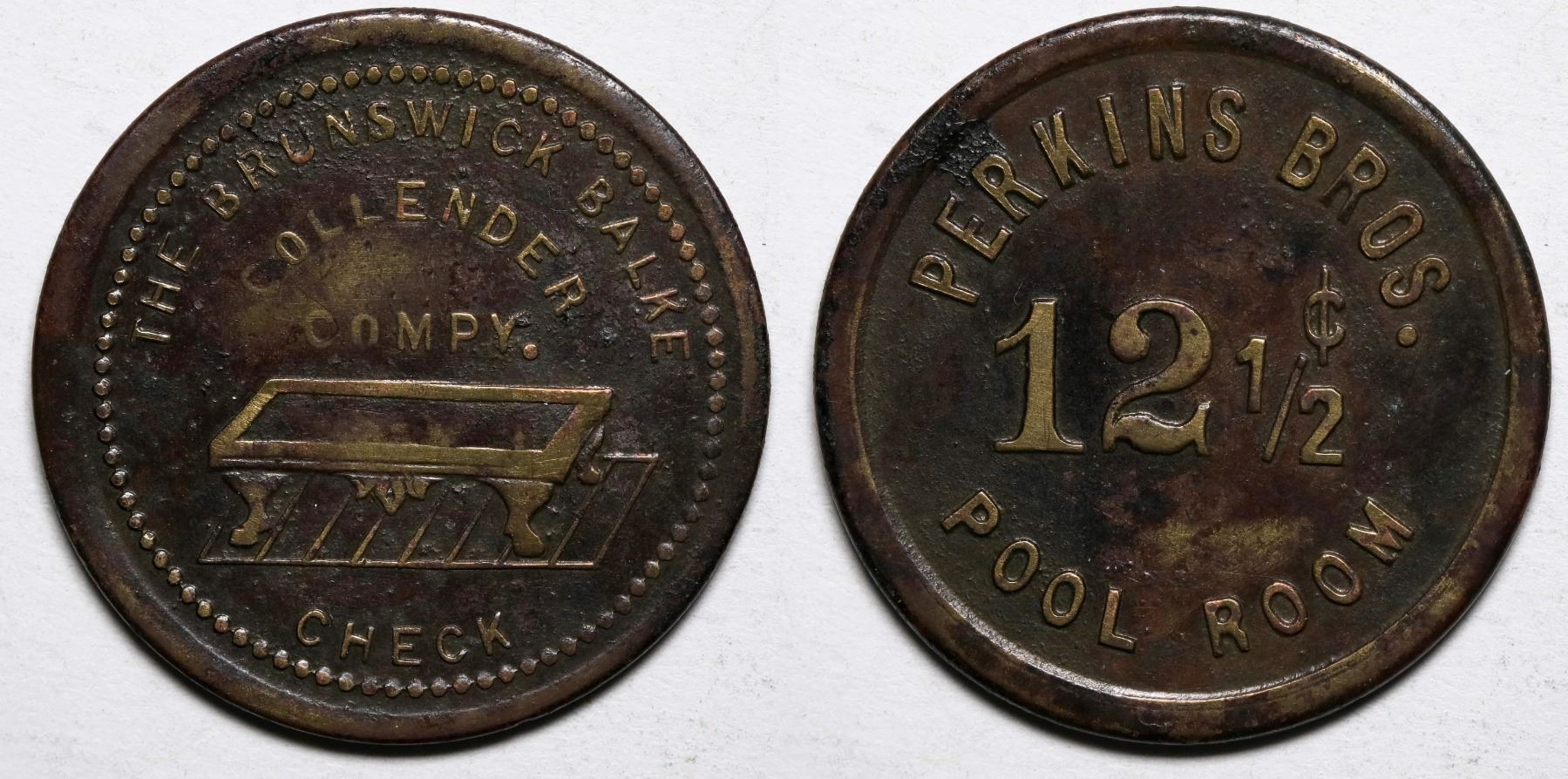 The Brunswick Balke/Collender/Compy/Pictorial of billiard table/Check//Perkins Bros./ 12 1/2¢/ Pool Room. Rd., Br., 25mm. R-8.