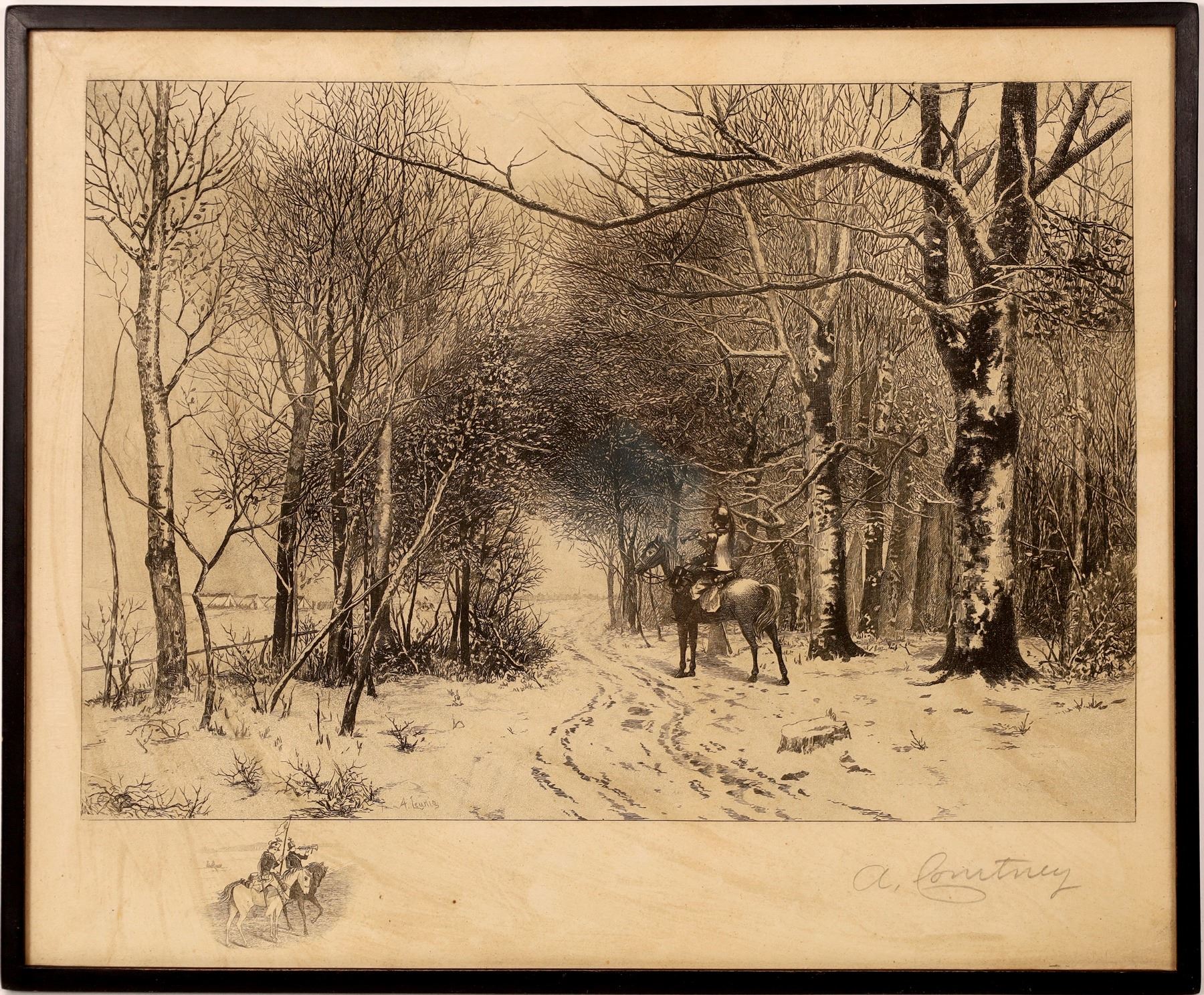 A beautiful signed etching by A. Courtney entitled "The Bugle Call." Piece was done in 1880. There is a less condition copy of this work in The National Gallery of Art in Washington D.C.
