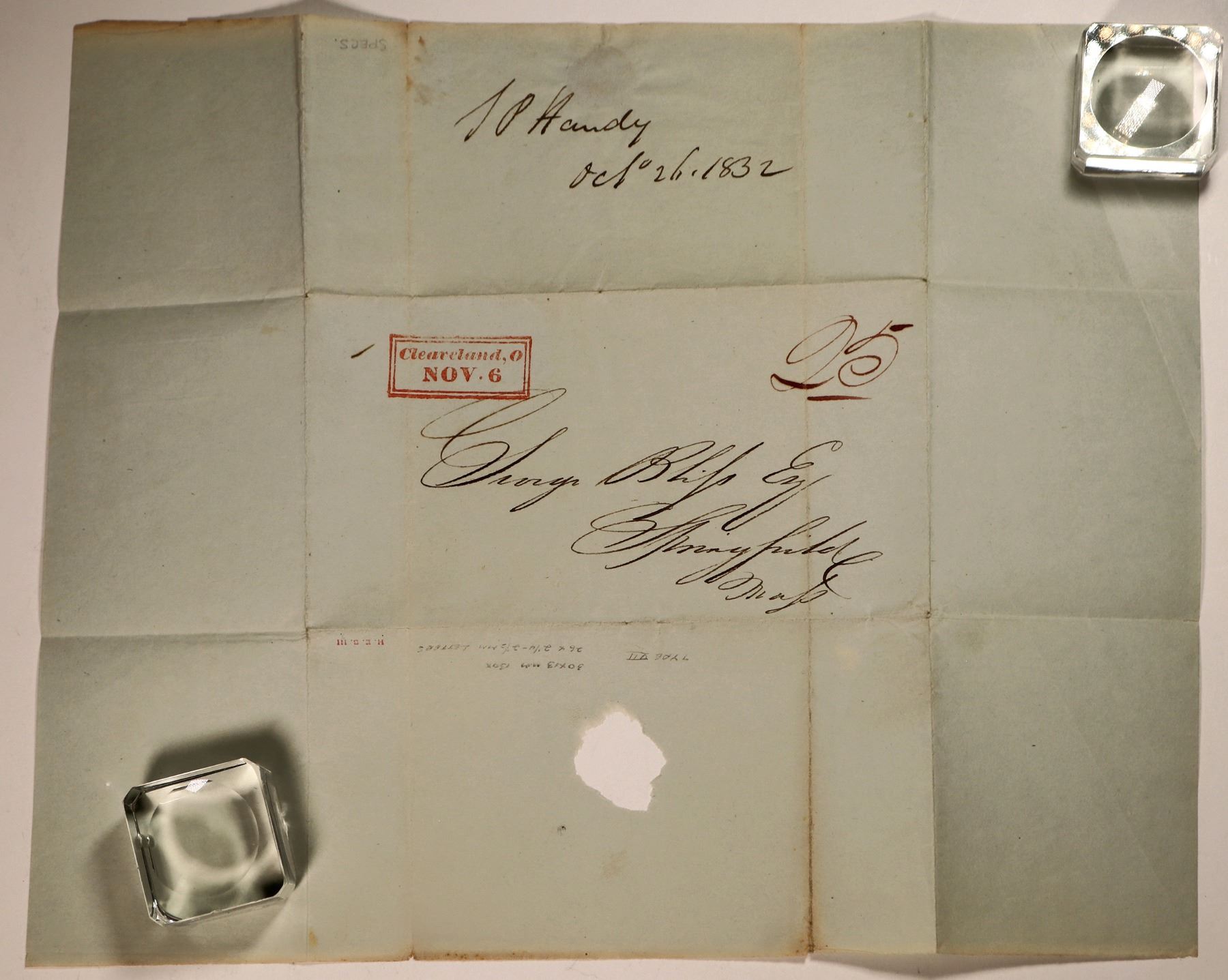 A cover with Cleveland, Ohio "Cleaveland, O" square double box rectangle red cancel, c1832. Hand-folded from piece of paper, about 10" x 8". 25 cent rate to Springfield, Mass., return address "TP? Handy, Oct. 21. 1832." Addressed to George Philip Esq. Springfield, Mass. "Type VII" written on reverse.[ Cleveland Ohio