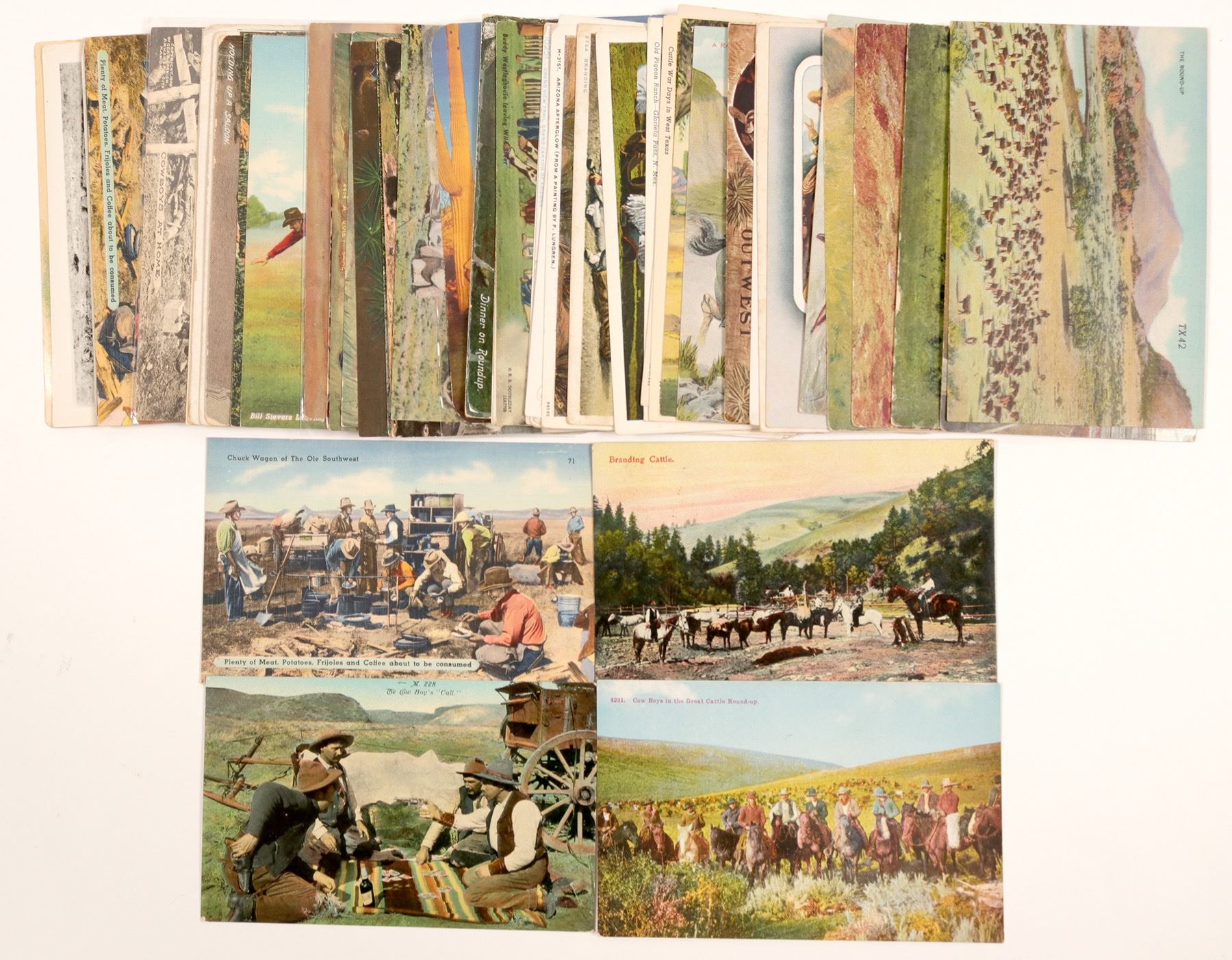 50 postcards and 2 duplicates. Colorful postcards of cowboys in scenic pictures including the Painted Canyon in the Badlands, eating at chuck wagons and riding horses. Picture of cowboy on horseback coming up on rattlesnake from painting from Bud Breen, a famous western artist.