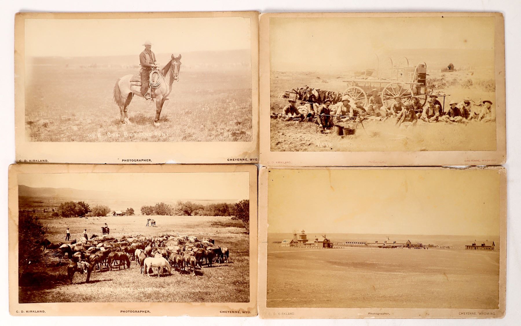 4 c. 1880 cowboy photos by Charles D Kirkland, who was active in Cheyenne from 1880-84. This is part of his Views of Cowboy Life series. Cabinet cards 7.6x4.25", beige single matte 8.5x5.25". Cowboy on horse, horse herd, Wyoming Prairie ranching(not part of the series) and a cowboy camp. Nice period Wyoming photos.