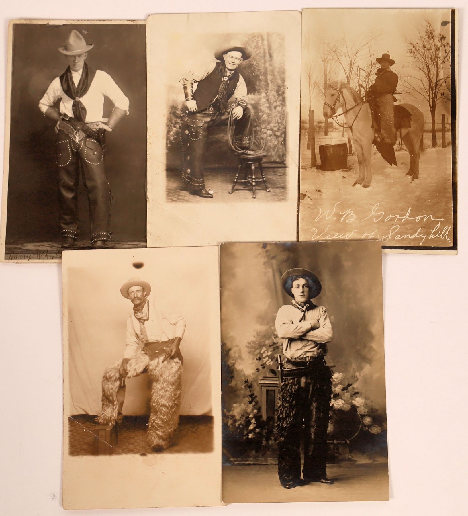 Collection of five (5) RPC's showing cowboys posing, one on horseback, the others in a photography studio. Please see photos for more detail and condition.