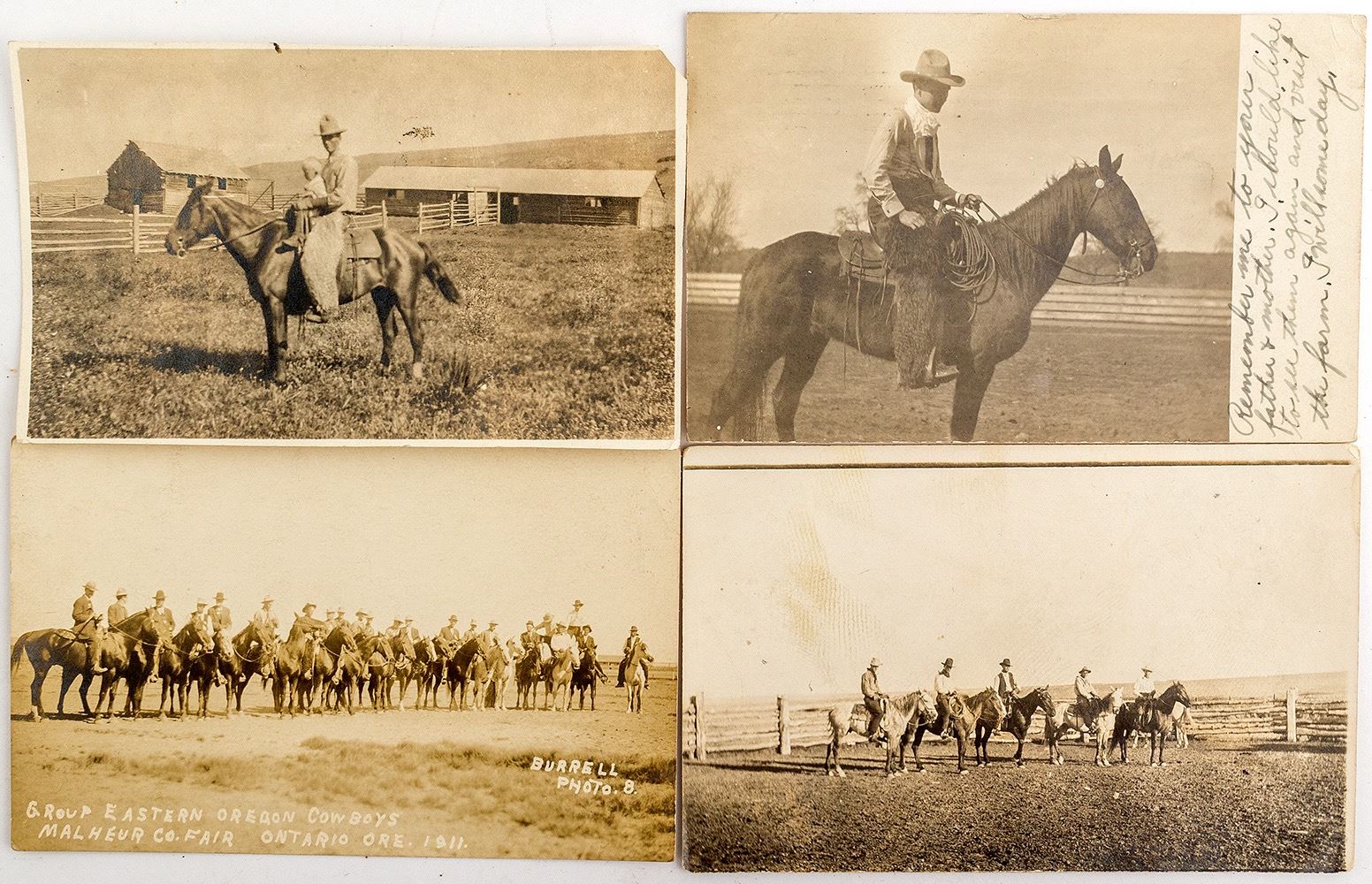 Lot of four: 1) "taken July 5, 1917" cowboy in wooley chaps and baby on a horse inside a corral. 2) Group of Eastern Oregon cowboys Malheur Co. Fair, Ontario, Oregon 1911. Burrell Photo. 3) Some South Dakota cowboys in wood rail corral, postmarked 1911. 4) Cowboy in Angora chaps, postmarked 1908 from California. State: City: Date: ID# 48942