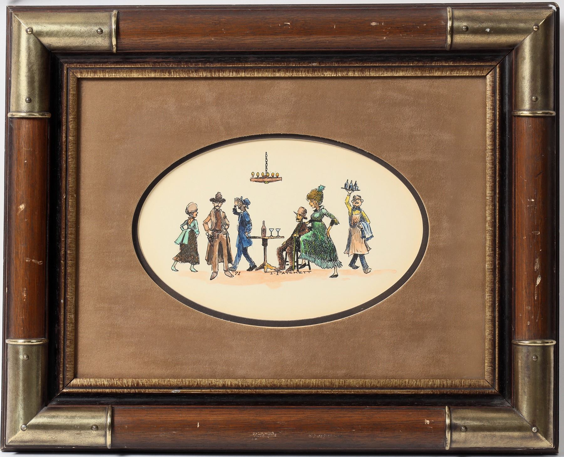 Framed original painting by T. Patchett '71. Men and women drinking in a saloon. Painting 5x8", frame 12.5x15.5".Frame has wear.