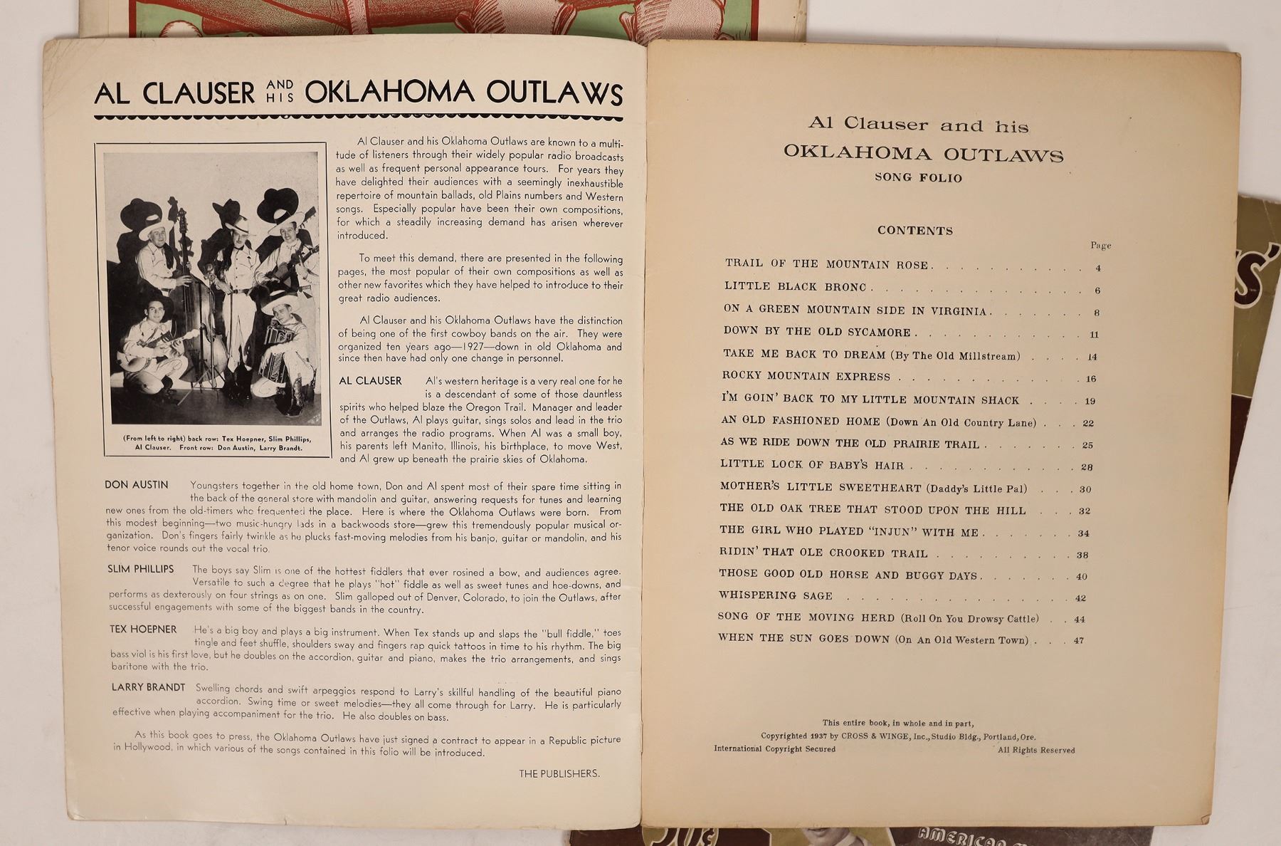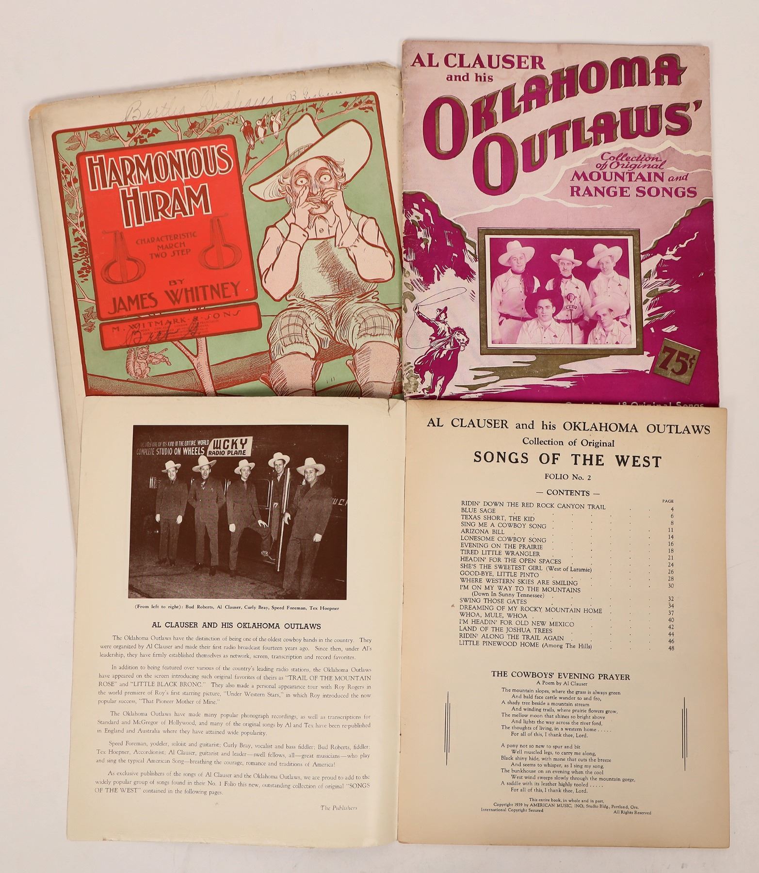 Song books of Al Clauser and His Oklahoma Outlaws. dated 1937 & 1939, containing songs like Blue Sage, Arizona Bill, I'm Heading For the Open Spaces and more. Also included is a piece of sheet music for Harmonious Hiram. In nice condition. Please see photos for more details.