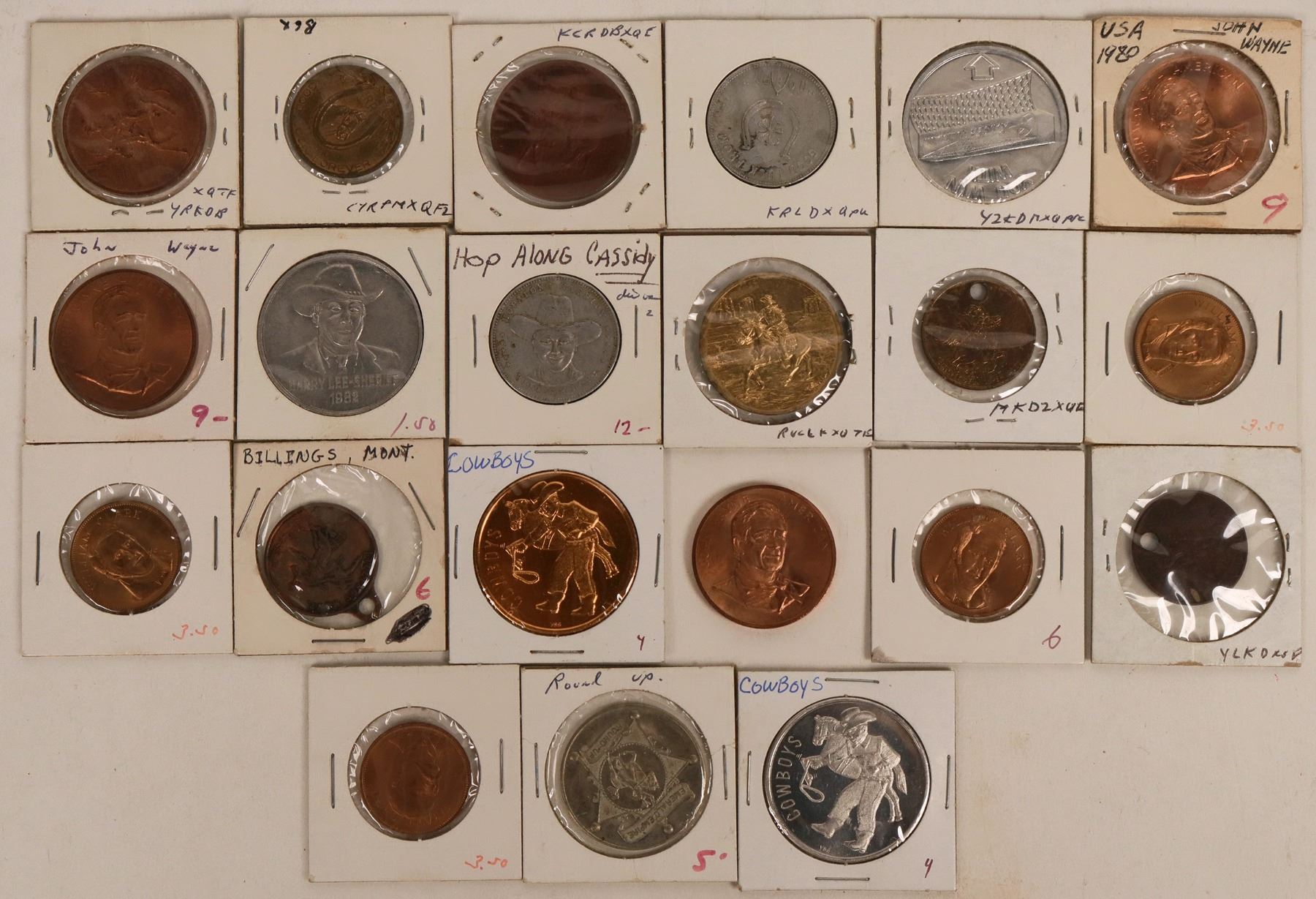 Twenty-one cowboy tokens and medals. While most feature cowboy actors like John Wayne, Roy Rogers and William Boyd (Hopalong Cassidy), there are a few dedicated to pioneering explorer William Clark. All are in very good condition. See photos for more details.
