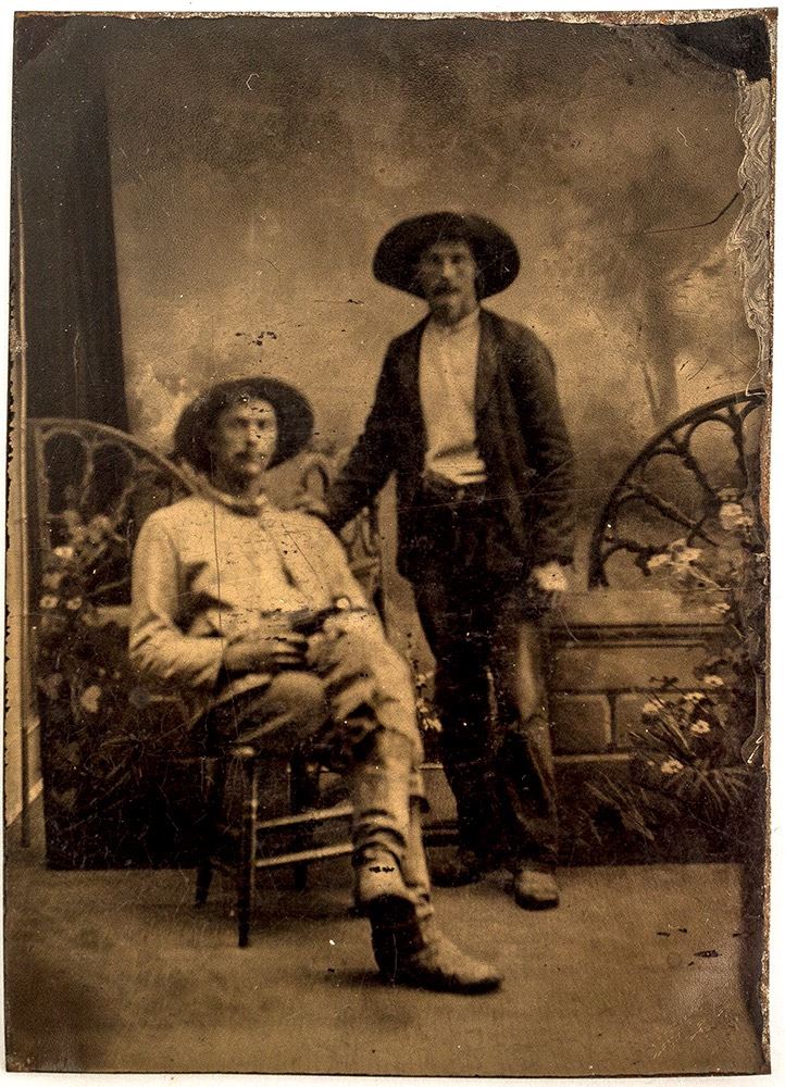 Two cowboys: on sitting in knee high boots holding a small barrel gun. The other standing looks to be wearing chaps as it is reflective of the light. Circa 1880s. 3 1/2 x 2 1/4 inches. State: City: Date: ID# 48943