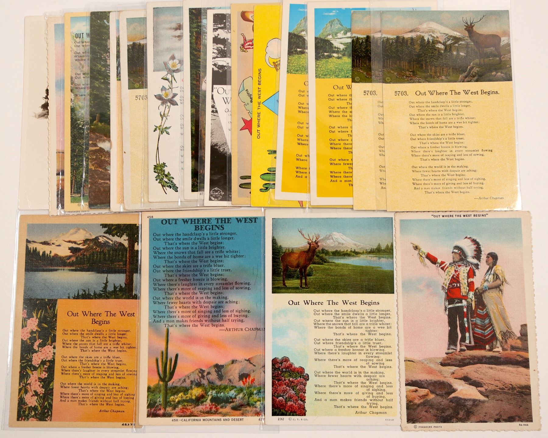 16 cowboy poetry with 3 duplicates. "Out Where the West Begins" is a poem written by Arthur Chapman and 1st published in his 1917 book of verse, Out Where the West Begins: And Other Western Verses. One black / white photo titled Out Where the West Begins of a cowboy sitting on dirt with his horse behind him. Another color picture of an Indian chief and squaw standing on rock outcrop saying "Out Where the West Begins" with Frasher Photo.