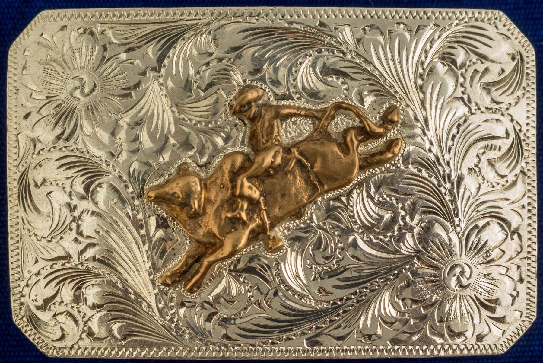 Western belt buckle with cowboy on raging bull. Cowboy an bull bronze color (bronze?) the planchet (sterling?) has some floral western motif etchings. Unstamped on back except "Mexico". SIZE: 3" x 2". In excellent condition. State: City: HWAC#: 48210 Date: