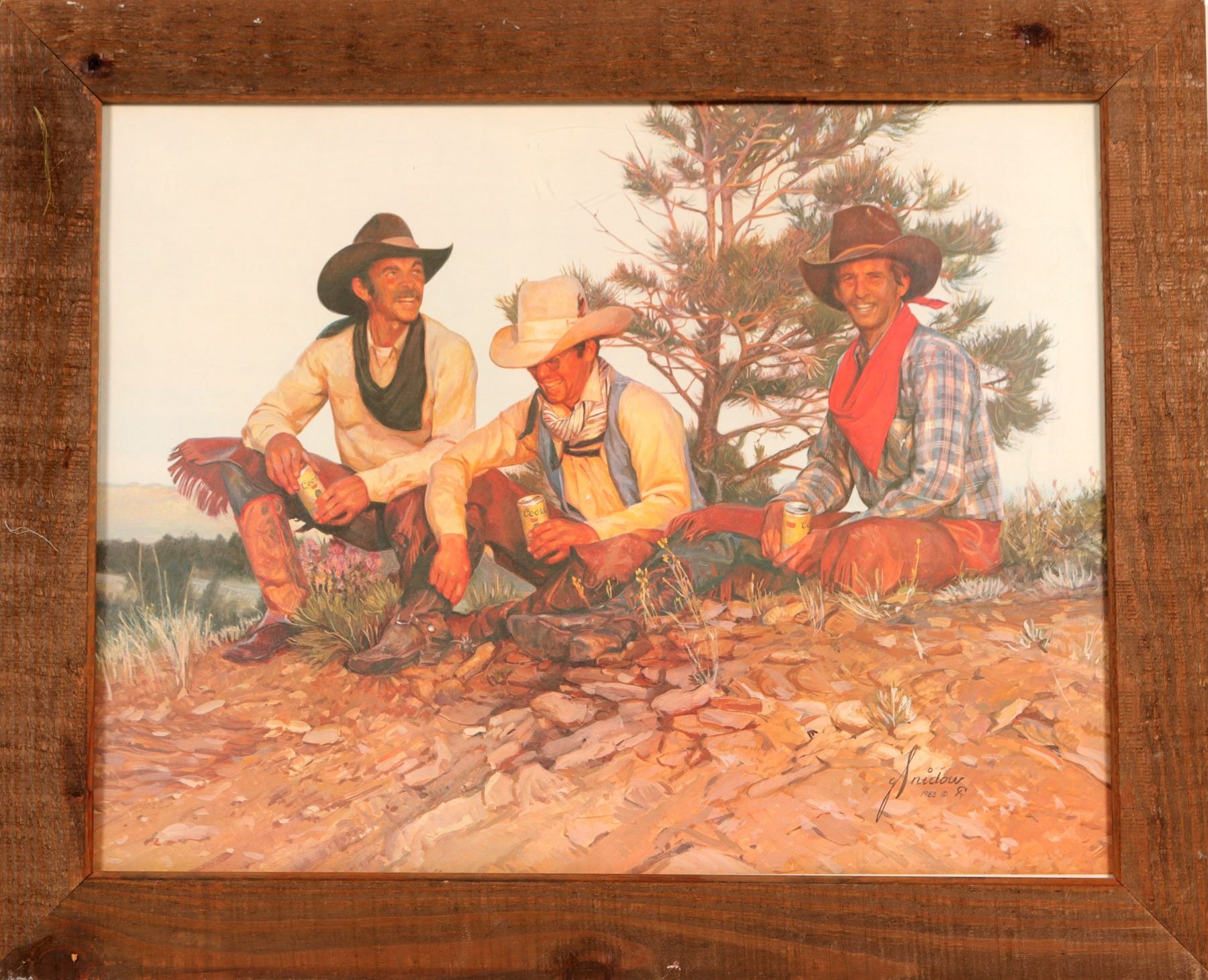 Here is one of the best, western themes. 3 cowboys relaxing on a knoll, and enjoying each others company, and having a cool drink. Yes, its another advertising print by Snidow, , for Coors Beer. 23 " tall x 28 1/2" wide. Really nice, and framed well .Sort of a knotty pine, rustic style.Wired and ready to be hung. Perfect condition. ( # 5 of 6, in this sale ) ( RH).