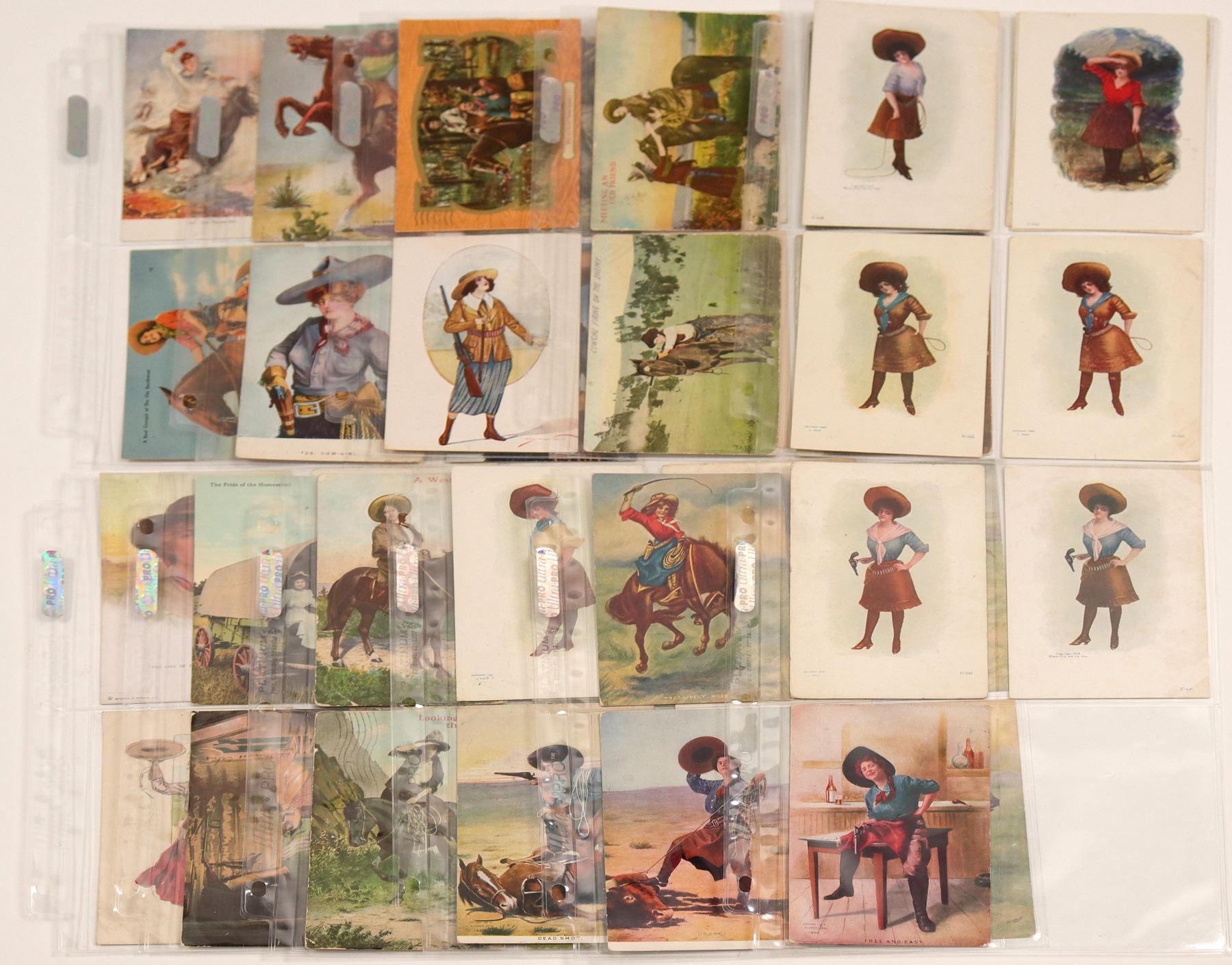 43 original cowgirl comic cards. 9 with guns, 18 with horses, 11 lasso and 4 whips