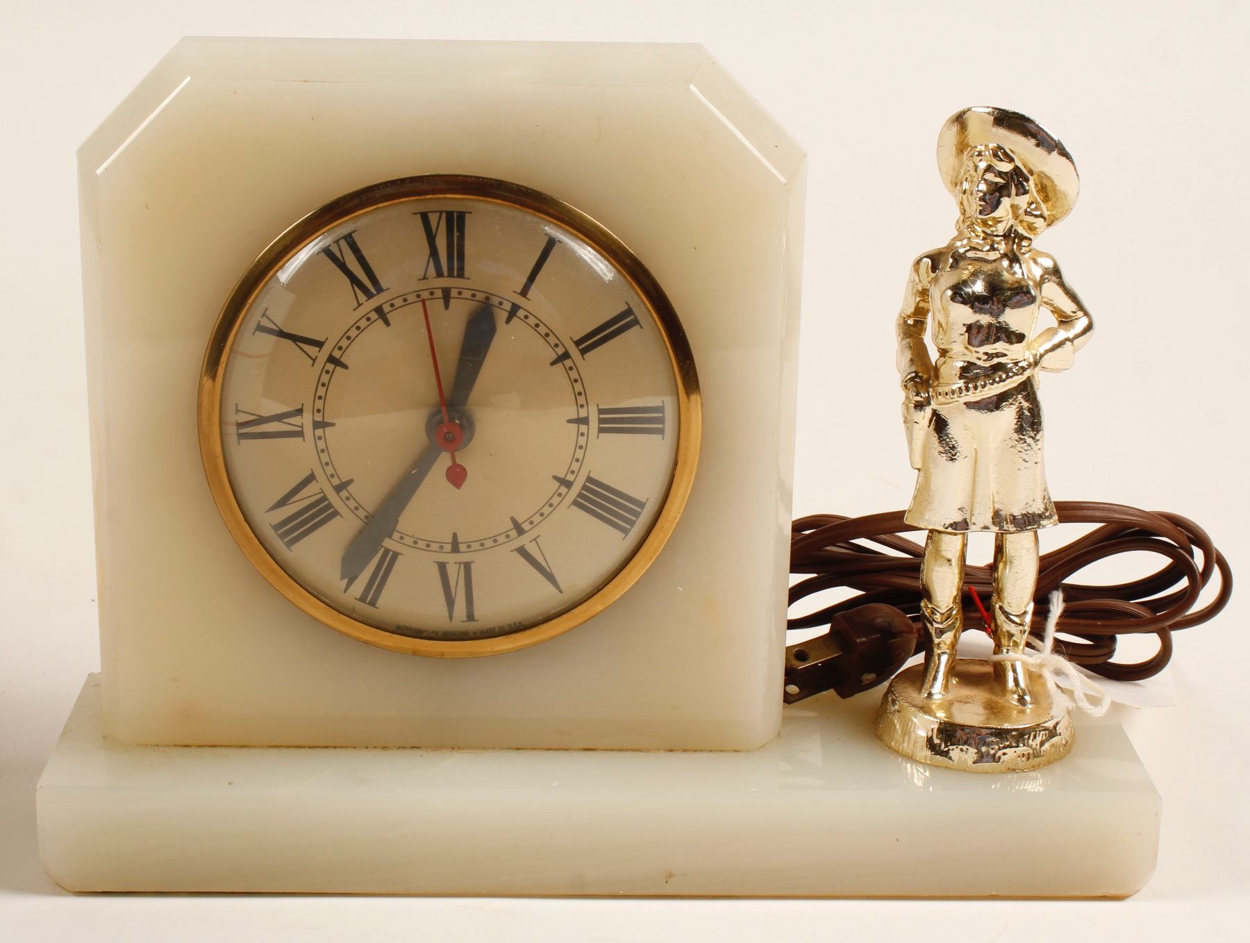 Vintage electric cowgirl clock 1950’s—1960’s. Clock works, base is 9 ½” by 3 ½ “ and 7” tall. White polished stone on base and upright. Date: City: State: HWAC# 62436