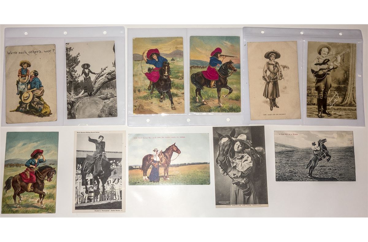 Lot of 11. No duplicates. Three are raised, color cards of the same cowgirl in different poses. Six are used. Fun collection!