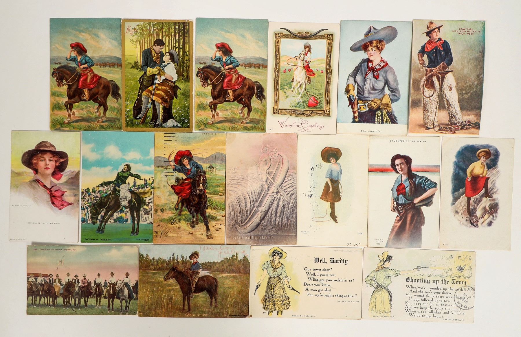 Lot of 17. No RPPC. Includes: Frontier Day, Cheyenne; Tad Lucas; cowgirl with Buffalo Bill's Wild West show; four raised cards; two in a series of Walter Juan Davis; and more early printed color cards. Please inspect.