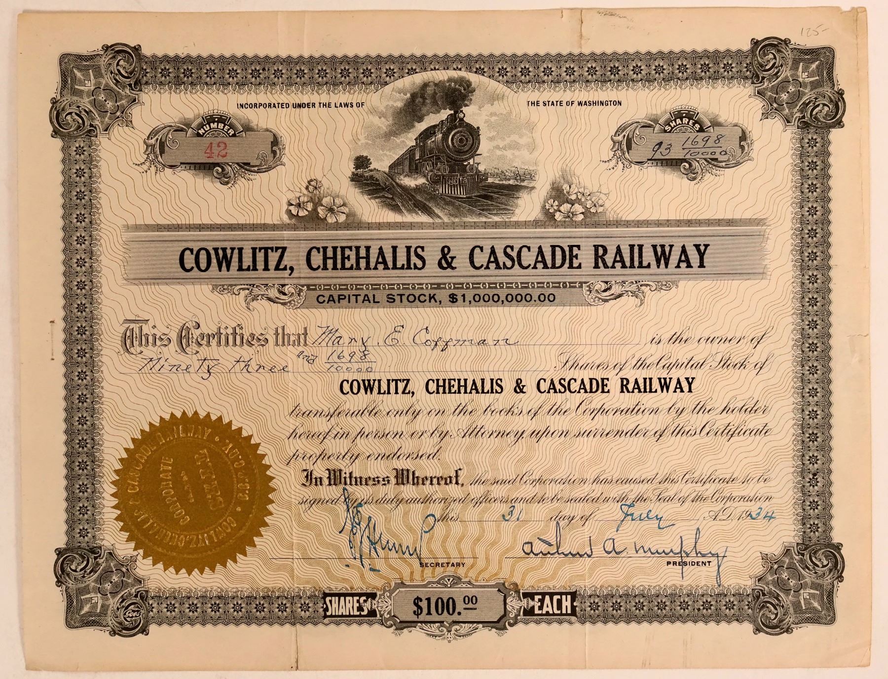 Chartered 1916 and stopped service in 1955 for a total period of operations of 39 years. Initially started 1912 as Washington Electric Railway was formed to push a trolley line north from Chehalis, Washington, a town of some size and several class 1 railroad connections to Centralia, Washington. #42, I/U, 93 + shares @ $100 ea. issued July 31, 1934 signed Arthur Murphy President. Gold corp seal, Black, vignette top frontal view 4-4-0, sunburst gold underprint. Goes printer. VF