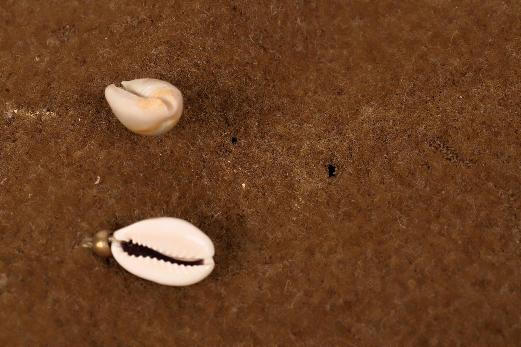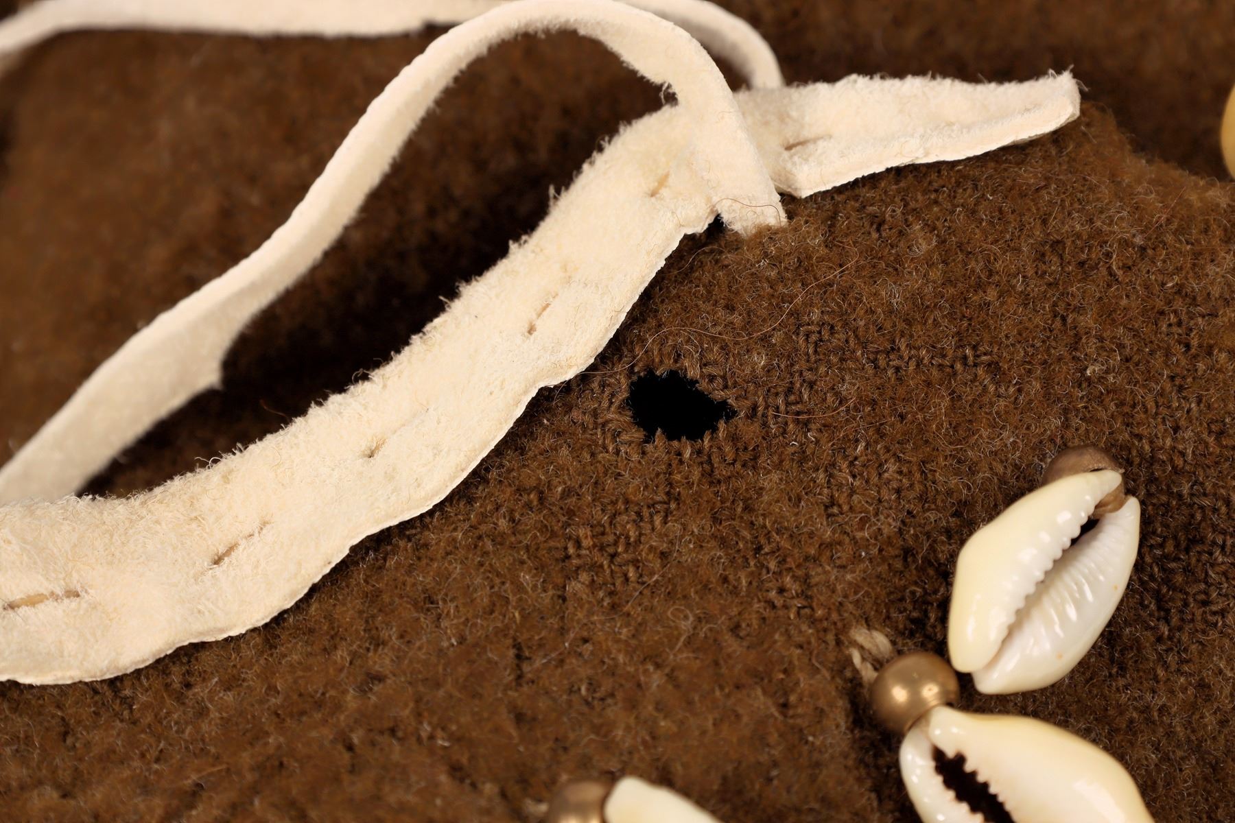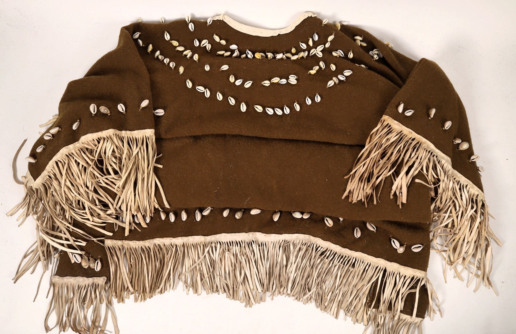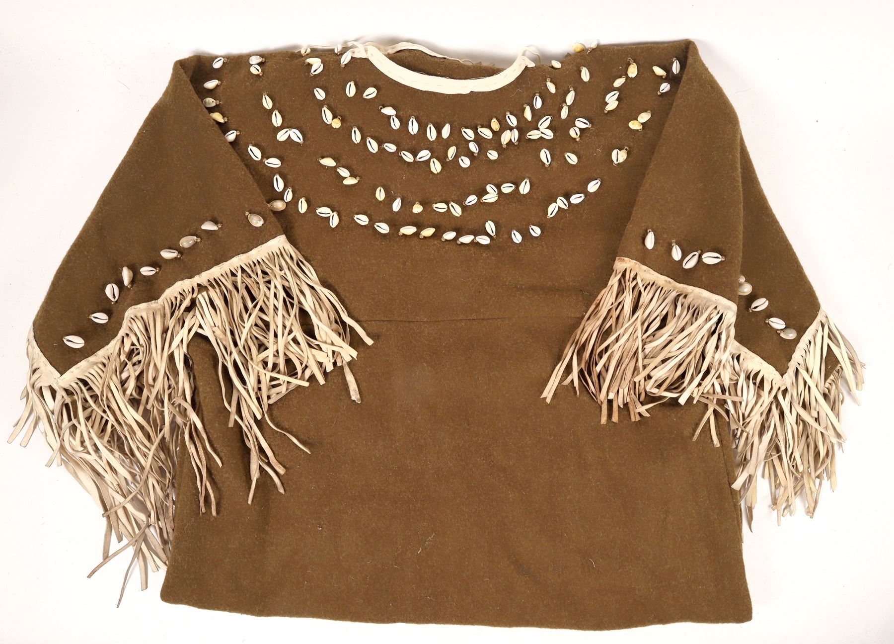 A cowrie shell American Indian design blanket dress. It appears to have been fashioned from an army blanket. It is trimmed with buckskin piping and fringe. It is about 53" long and about 36" wide. No apparent tears or holes. Please see photos for more detail. South Dakota
