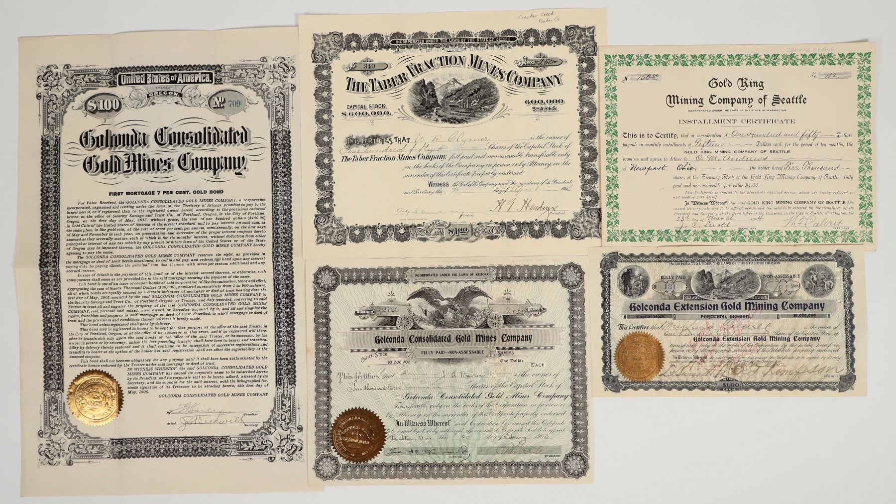 Lot of 5 different for this district near Sumpter. Includes: Taber Fraction Mines Co. (1906); Golconda Cons. Gold Mines Co. (1903 stock and 1905 bond); Golconda Extension Gold Mining Co. (1902); and Gold King Mining Co. of Seattle (1904 installment certificate). Please inspect.