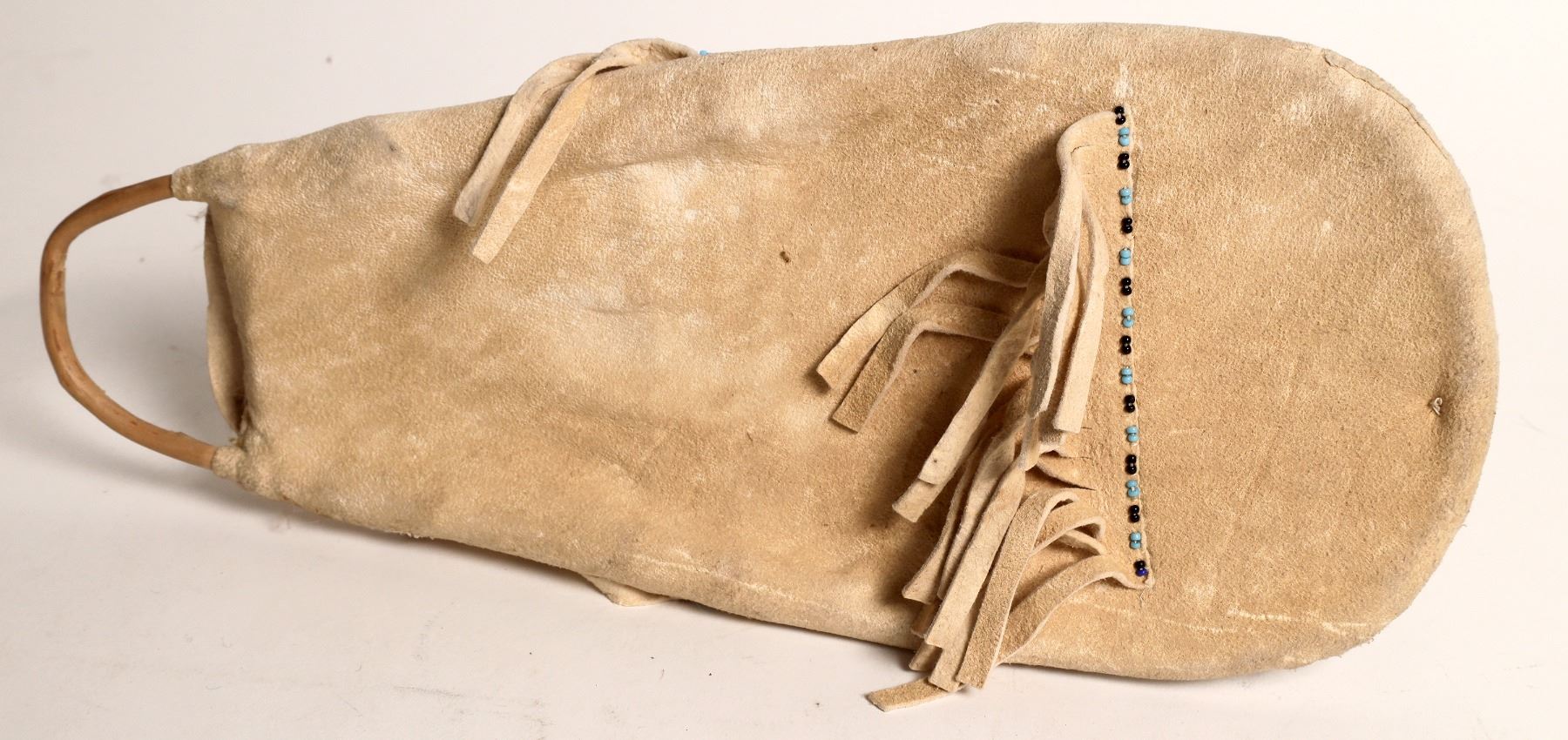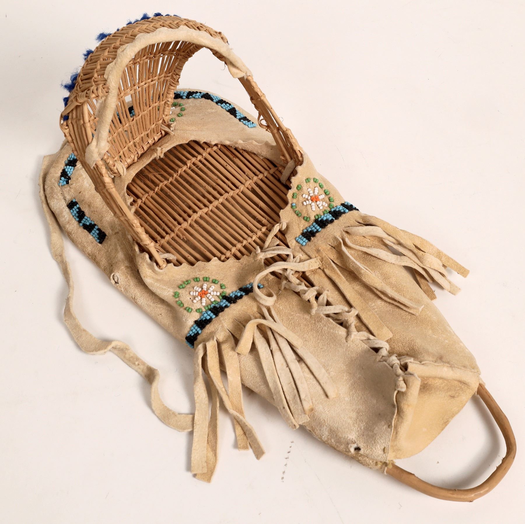 This is a cradleboard meant for the tourist trade. It measures 13 in. X 6in. wide. Some bead loss on the left side. Good condition. Tanned deerskin. Please see phot for details.