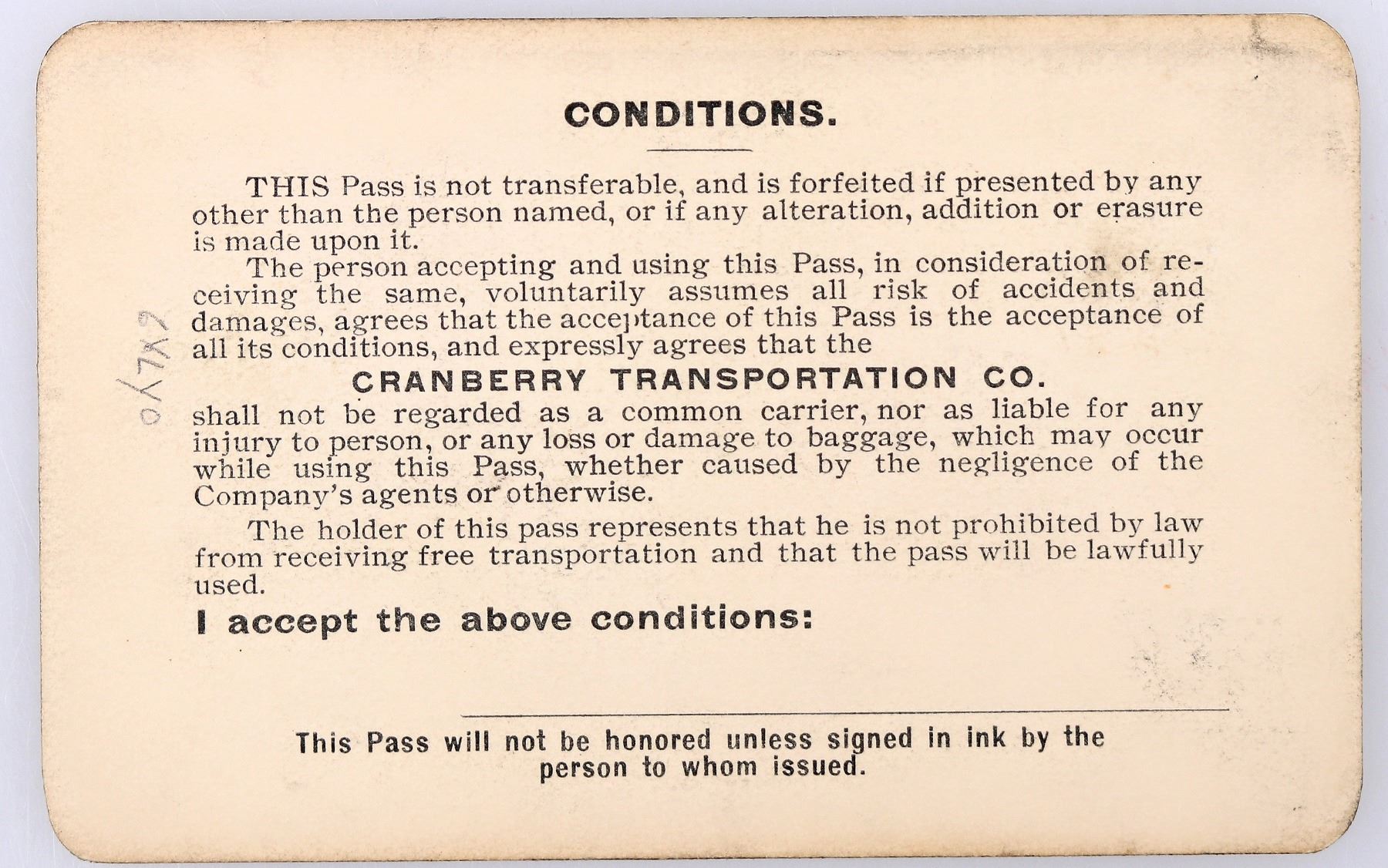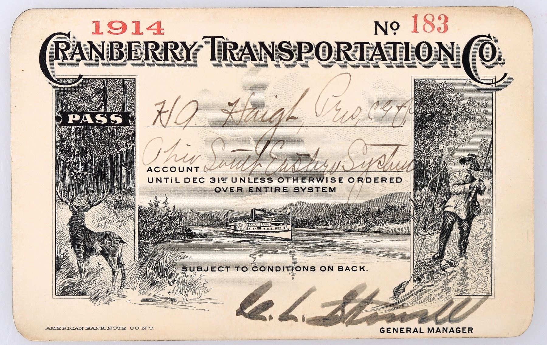 Stunning pass issued for the year 1914 to HA Haight of the Ohio South Eastern System. Signed by general manager Stowell(?). Completely illustrated with elk vignette at left, fisherman at right, and steamboat in center. Printed on cardstock by ABN. Incorporated in 1904 to operate from Carthage, Jefferson County, NY, and have steamers on Cranberry Lake, Oswegatchie River, Adirondacks.