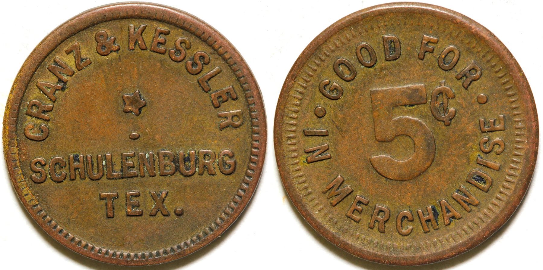 A town founded in 1831 by German immigrants half way between Houston and San Antonio. Token is FD 5c IM HWAC# 52079 Date: Location: Schulenburg, Texas