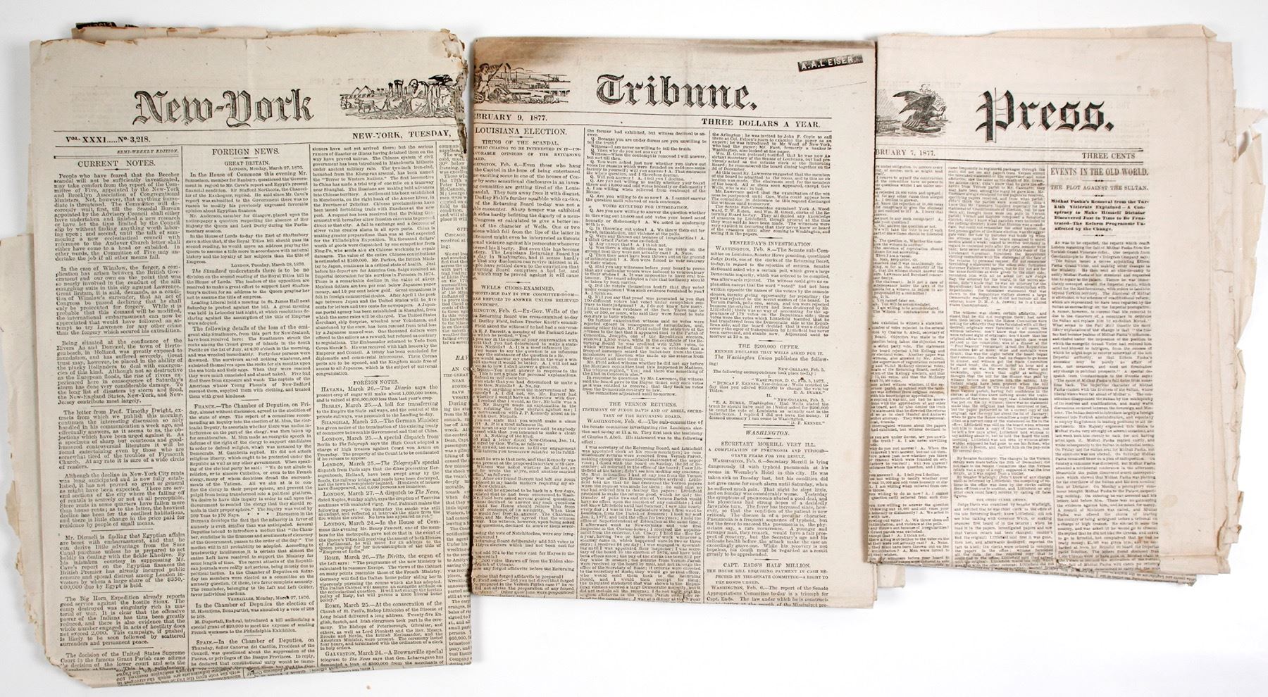 Crazy Horse, a Lakota Chief who fought with Sitting Bull at the Little Big Horn, was in numerous battles with whites until his surrender in the beginning of summer 1877. three months later, soldiers killed him in a Fort prison camp. One of the papers (New York trib, 2.9.1877) discusses the defeat of Crazy Horse's band, but not his capture. Another (Philadelphia Press, 2.7.77) discusses the same battle. a third (3.28.76, New York trib) discusses the destruction of Crazy Horse's camp. Date: Location: HWAC# 63912