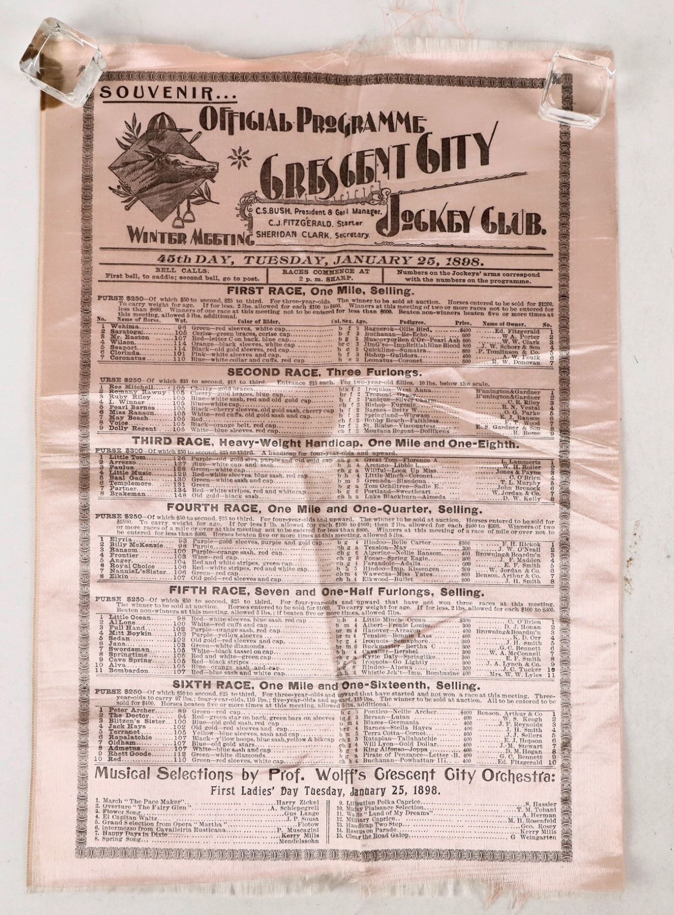 Cute souvenir Official Program for the winter meeting of the Crescent City Jockey Club, January 25, 1898. Lists the various horse races on that day as well as musical offerings by the orchestra. No printer listed. 13 x 9"