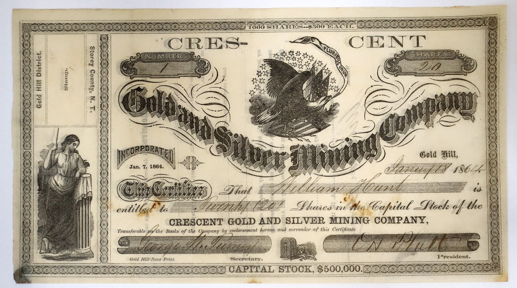 Gold Hill District, Storey County, N.T. (printed at upper left). Incorporated January 7, 1864. Stock number ONE, issued for 20 shares to William Hunt on January 18, 1864 in Gold Hill. Countersigned on reverse by Hunt. Signed by president O. H. Platt and secretary George W. Turney. Not cancelled. Black border and print, two vignettes: eagle on patriotic shield (top center) and allegorical woman (lower left). Gold Hill News Print. Pinholes, folds, a few stains, paper remnant on back lower left corner. Despite being advertised on the certificate as $500 each, the highest price I saw for a share being sold was $8. I only found reference to this company the first six months of existence. Hunt was a mover and a shaker at American City where he was located. This is a rare reference. Turney was a mining broker and secretary to many mines (at least 16!). Platt was a stock broker and commission agent. Notes on the people and company included.