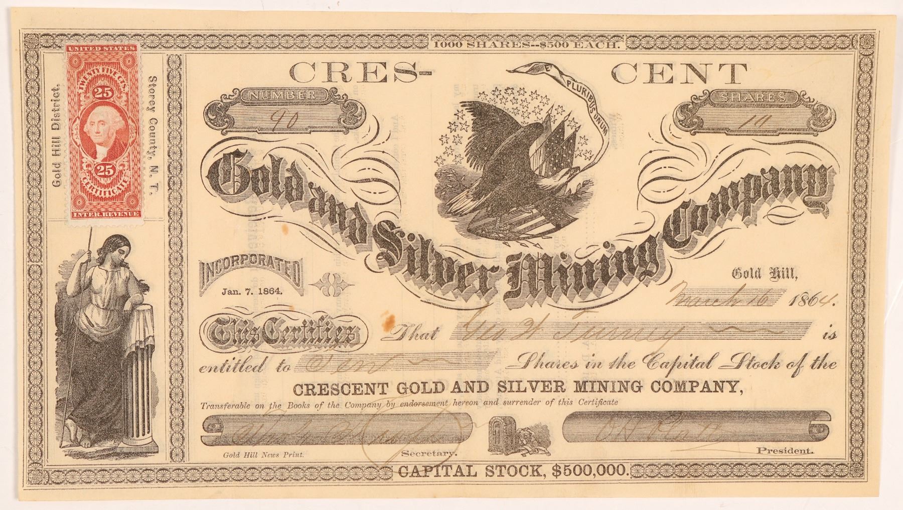 No. 90 for 10 shares to A Servis. Signed by president OH Platt and (?) secretary. Dateline Gold Hill March 16th, 1864. Incorporated January 7, 1864. Revenue stamp. Not cancelled. Allegorical and Eagle vignettes. Gold Hill News Print printer. No other edge corner or discoloration issues. This company should not be confused by the companies with the same name at Esmeralda and Silver Mountain. Plat was the Gold HIll pastmaster at this time?