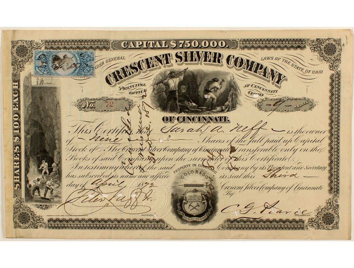 Argentine District. Inc. in Cincinnati, Ohio. No. 72. Pen and punch cancelled. Issued for 9 shares to Sarah A. Neff on Apr. 3, 1872. Signed by C.G. Pearce (president) and Peter Neff Jr. (secretary). Reverse is signed by Sarah Neff. Ornate border with three vignettes: miners working with an ore bucket being lifted (left), miners working underground (top center), and the Colorado seal. Printer: American Bank Note Co., Cincinnati. Blue 25 cent revenue stamp upper left that has been punched. The company operated mines and mills in the Georgetown, CO area from 1869 to the 1880s. They eventually owned mines in the Columbus and Stevens lodes. Condition: light soiling. Measures 11" x 6 ½."City: GeorgetownCounty: Clear CreekState: CODate: 1872