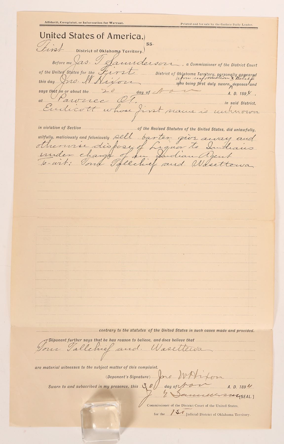 Printed by the Guthrie Daily Leader this affidavit, complaint or Information for Warrant was completed Nov. 20, 1894 at Pawnee, Oklahoma Territory: "Endicott whose first name is unknown...did unlawfully, willfully, maliciously & feloniously sell barter give away & otherwise dispose of Liquor to Indians under charge of an Indian Agent. To-wit: Tom Tallchief & Wasettewa." Signed by U. S. Marshall John Hixon & U. S. Commissioner James Sanderson. 13 x 9 inches. Marshall Hixon organized & led two dozen lawmen into the "Battle at Ingalls," (September 1, 1893) to capture Bitter Creek Newcomb, Bill Doolin, Dynamite Dick & others. [Guthrie Oklahoma