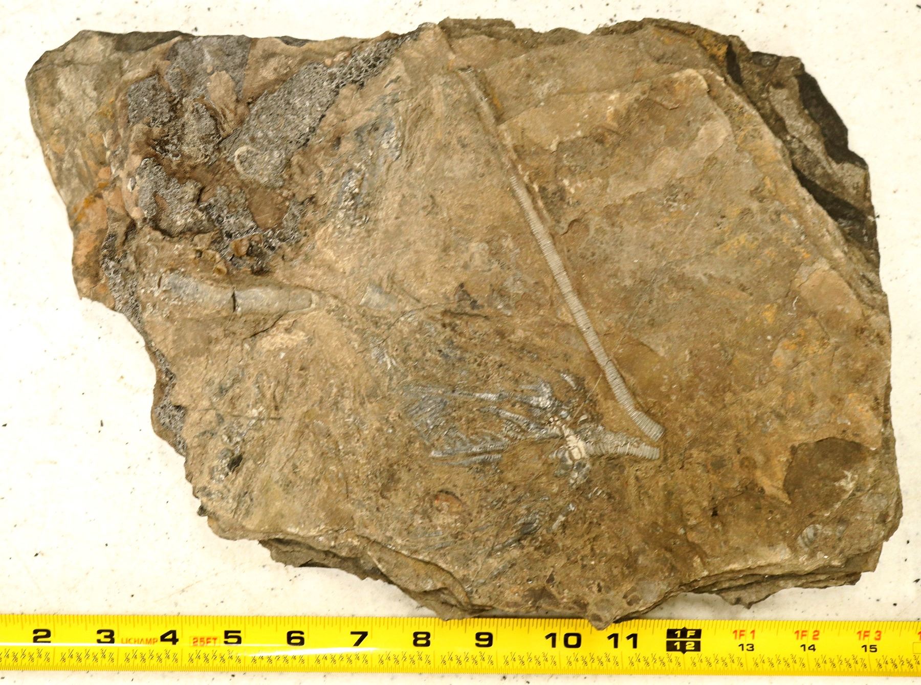 A large fossil plate of crinoids, known as 'sea lilies'. These ancient organisms had a large 'flower' on a long, segmented stem, and were in the same family as modern starfish, sea urchins, and sand dollars. This small plate shows a very nice 'flower' and numerous stems. This fossil is 250-450 million years old and originates from China. 15" x 10", 2" thick.