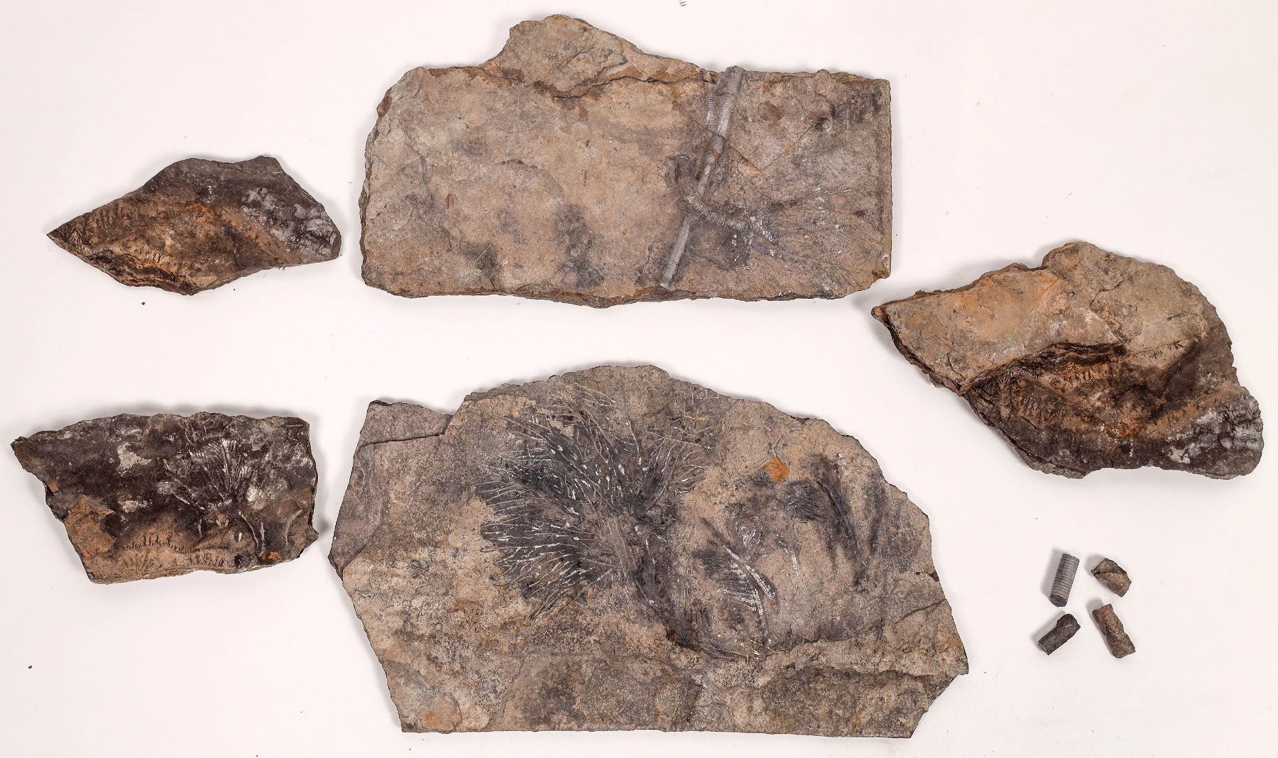 Plates of dark gray silty limestone with crinoid impressions including several with branching crown: largest 12.0 x 7.0 x 0.75", others to 5.5 x 2.75 x 0.5", plus 4 small individual stalks 1.0 to 0.7" long. China Chunlin Zhu Collection