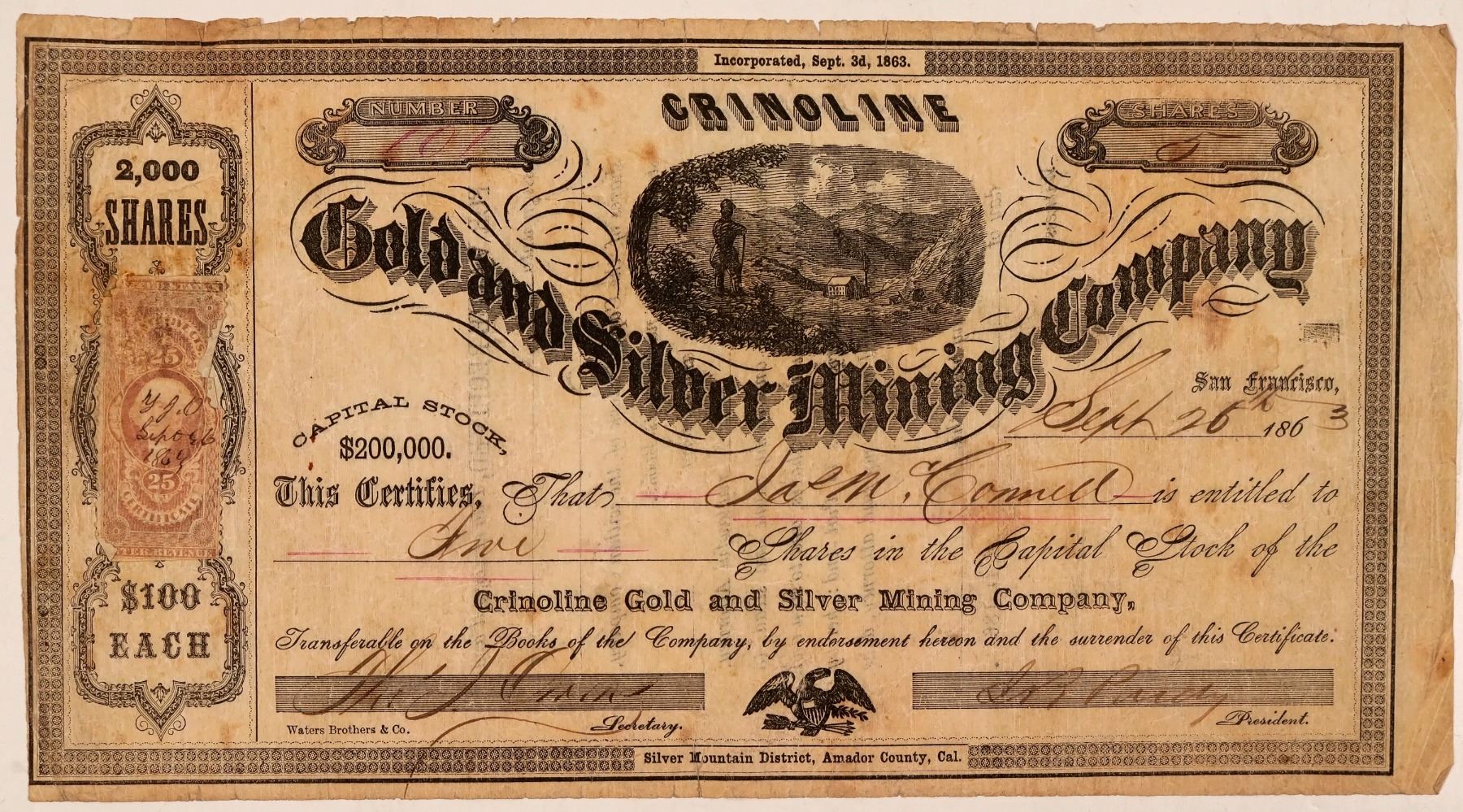 "Silver Mountain District, Amador County, Cal." printed at bottom center. Inc. Sept. 1863. No. 101, issued for 5 shares to Jas. M. Connell on Sept. 26th, 1863, in San Francisco. Signed by president IB Purdy and secretary Thomas Owens. Not cancelled. Black border and print, vignettes of man looking down at mine and and eagle on shield. Printed by Water Brothers & Co. 25 cent adhesive revenue stamp attached on the left. Folds, creases, heavy toning and some soiling. Wear to edges. 5.5 x 10" The Crinoline Company patented their property. Located on the Crinoline Lode. Silver Mountain California