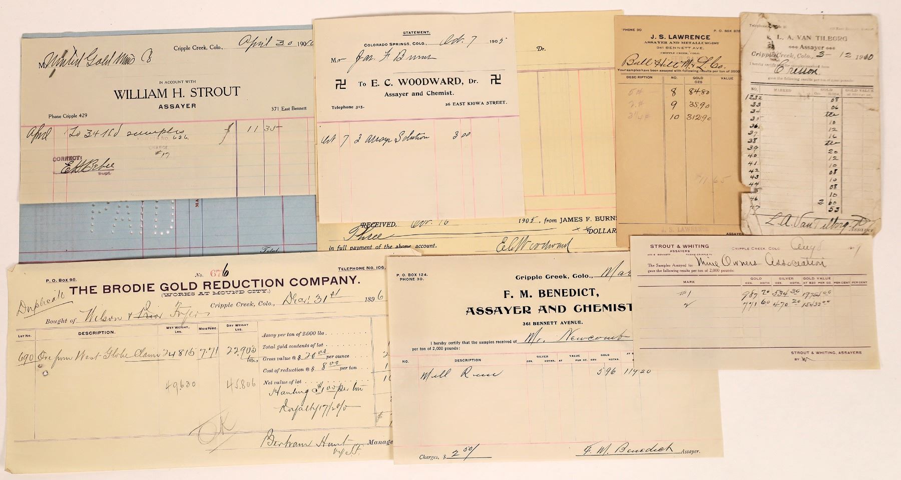 Lot of 7 1) Brodie Gold Reduction Company. For Wilson & Fryer. 1896. Gross value $293.16. 2) EC Woodward, assayer and chemist. Sold assay solution to James F Burns. Signed by Woodward. Attached to James F. Burns voucher. 3) FM Benedict, assayer and chemist. To Newcomb. Sold mill r---. Signed by Benedict. 1899. 4) LA Van Tilburg, assayer. 16 samples ranging from 6c to $2.60 for Cresson. 1910. 5) Strout & Whiting assayers. 1919. Two assay results for the Mine Owners Association, #1 gold value $17,754. #2 $15,432. 6) William Strout, assayer, For samplers. 1910 7) JS Lawrence, Assayer and Metallurgist. For the Bull Hill Mining & Leasing Company. 1906. Cripple Creek Colorado
