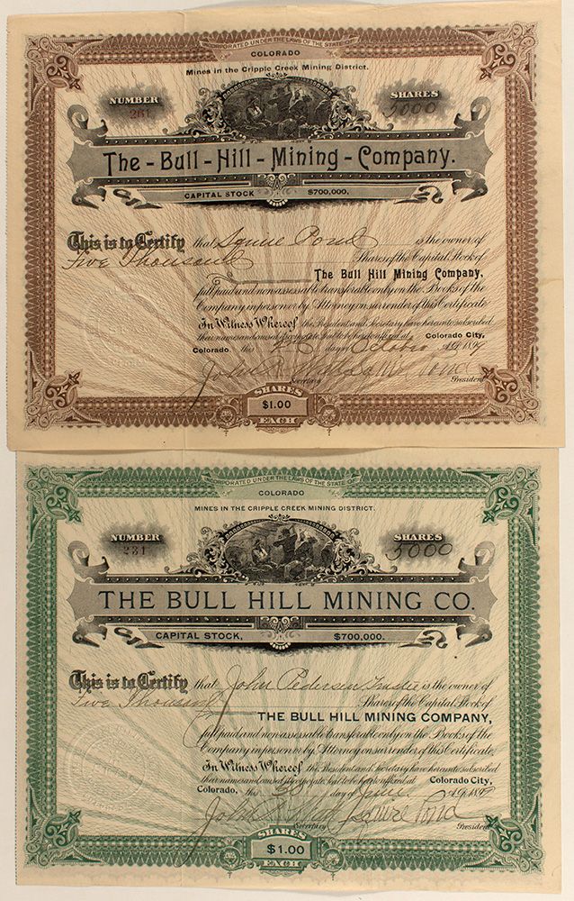 Lot of 2 certificates incorporated in Colorado. 1) Cert. #231 issued to John Pedersen in June 1899 for 5000 shares. Signed by Squire Pond, president, and John R. Watt, secretary. U/C. Printer not noted. Green borer and safety print, with embossed se al. Datelined Colorado City, CO. 2) Cert. #261 issued to Squire Pond in October 1899 for 5000 shares. Signed by Squire Pond, president, and John R. Watt, secretary. U/C. No printer noted. Brown border and safety print with embossed seal. Squire Pond was also president of the Colfax (gold) Mining Company with claims at Cripple Creek [Ref: The Mine, Quarry and Metallurgical Record of the United States, Canada and Mexico, 1897, p. 400]. Both certificates VF.City: Cripple CreekCounty: TellerState: CODate: 1899