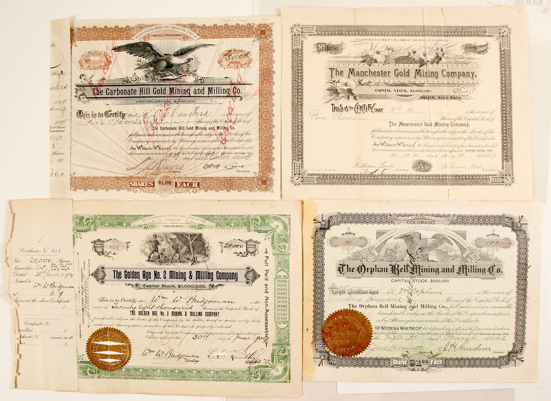 5 good Cripple Creeks stocks. Orpan Bell Mining 1892, Golden Age No. 2 Mining 1904, Manchester Gold Mining 1897, Carbonate Hill Gold Mining 1899, Phonolite Mountain Gold Mining 1898.