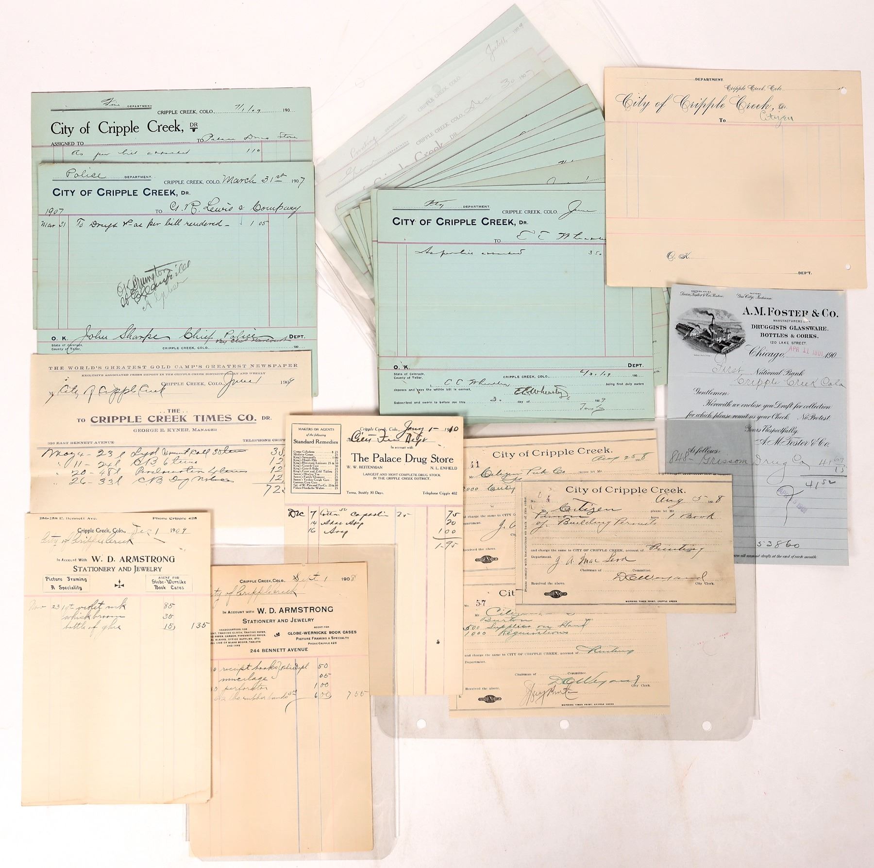 Lot of 24. Best: Palace Drug Store (1910, great to match with your bottle); Cripple Creek Times Co. (1909); WD Armstrong Jeweler (1908 and 1909). Rest are City of Cripple Creek billheads incl. to the Palace Pharmacy, Palace Drug Store, and CR Lewis & Co. (druggists), 1907-1910.