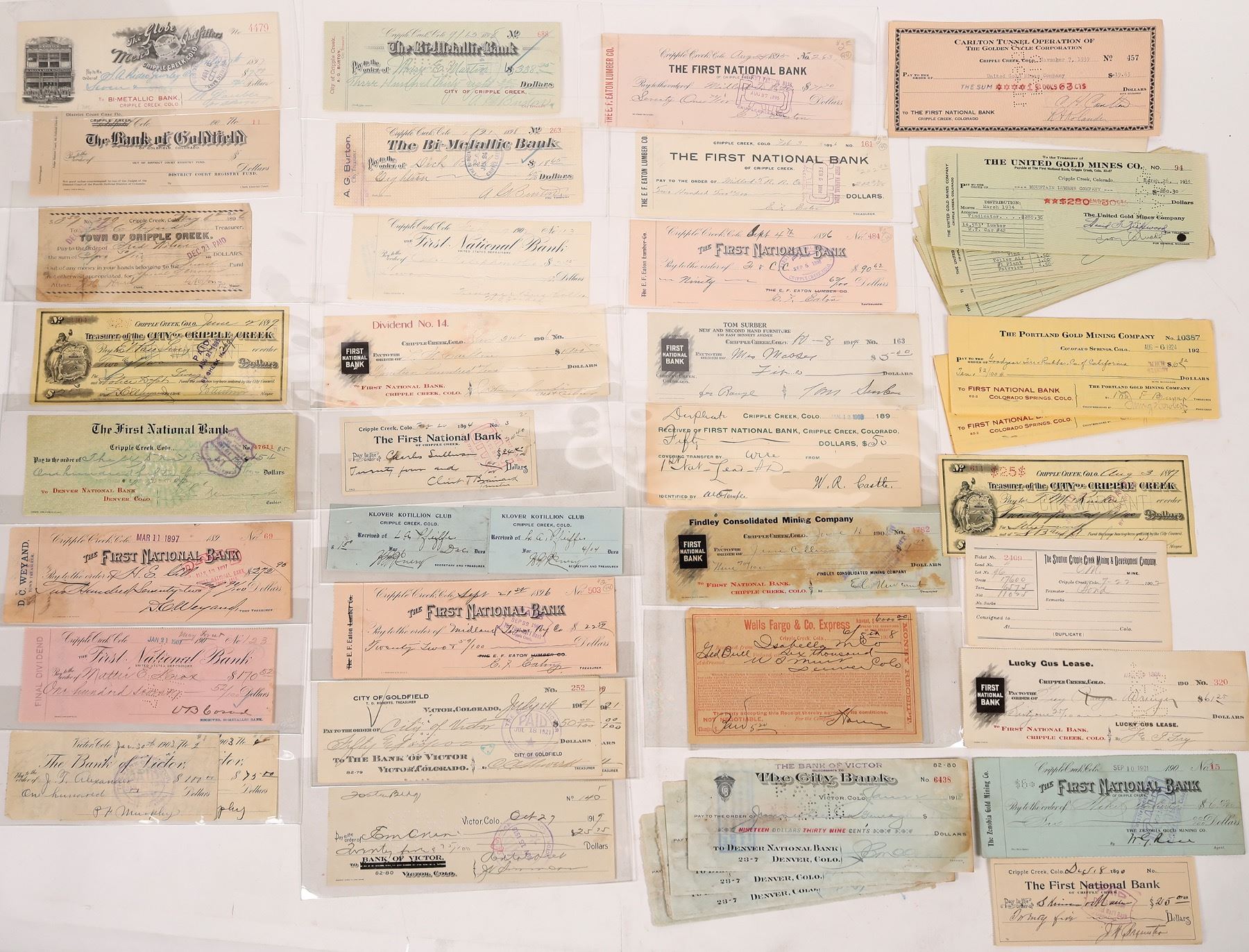 About 45 Cripple Creek and Victor checks. c. 1890's-1938. First National Bank, Globe Men's Outfitters, Bank of Goldfield, Bi-Metallic Creek Bank, Tom Surber, Portland Gold mining etc.