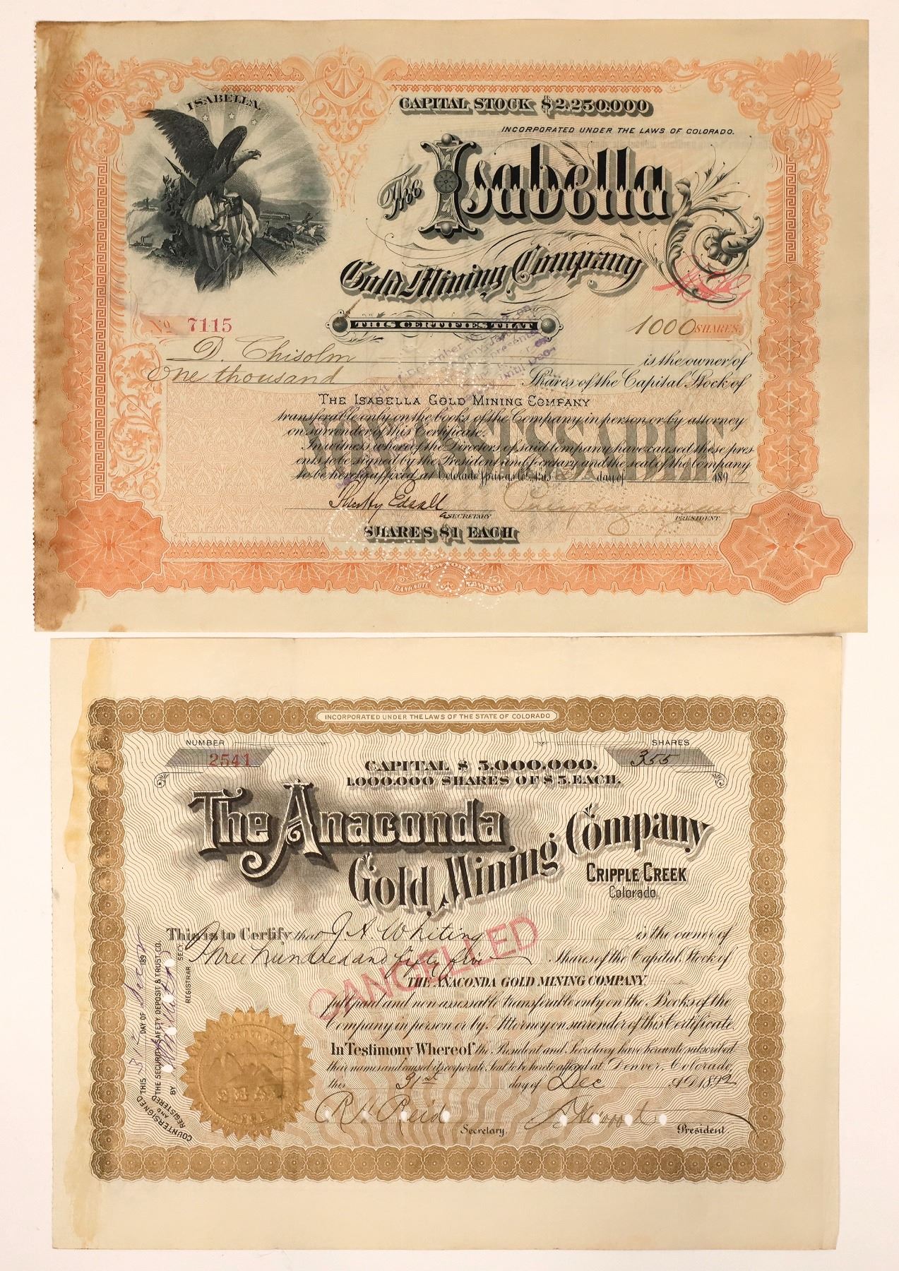 Lot of 2 different. 1)Anaconda Gold Mining Company. Stock no. 2541, issued for 355 shares to JA Whiting in 1892. Signed by David Moffat as president and RH Reid as secretary. Punch and stamp cancelled. Gold border and seal, black print. Folds, pinholes, discoloration on left border. Moffat was a Colorado railroad and mining tycoon. 2) Isabella Gold Mining Company. Stock no. 7115, issued for 1,000 shares to D. Chisolm in 1896. Signed by president Percy Hagerman and the secretary. Punch cancelled. Orange border and eagle vignette. Folds, pinholes, staining on left side. Percy Hagerman was a businessman, outdoorsman, and well-known mountaineer who painted the mountains he was climbing. Hagerman Peak near Aspen is named for him. He inherited properties from his father, James J Hagerman, who owned and sold the Colorado Midland Railway Company and was an investor in the gold mines of Cripple Creek.