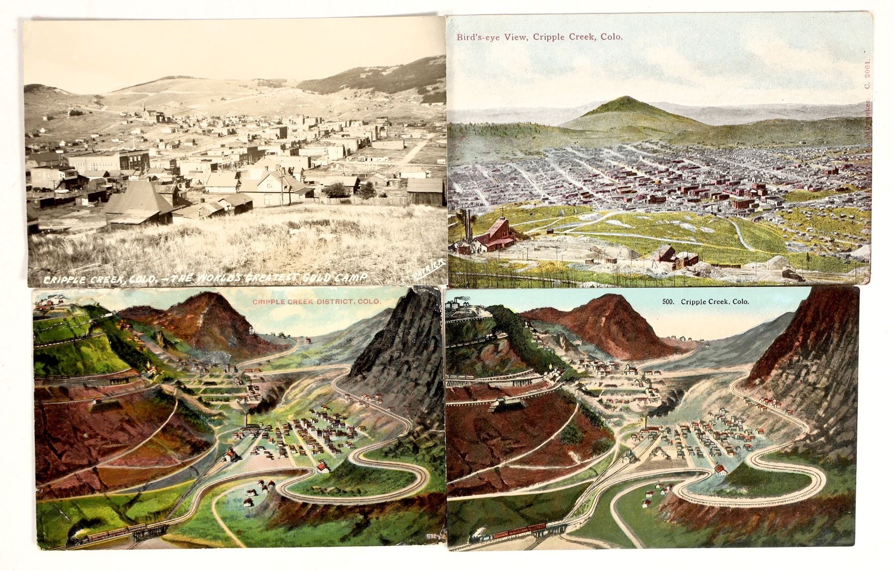 Lot of 4. Postcard of Cripple Creek, Colorado birds eye view. On of the original gold camp and later after growth. Two "Fantasy Views" w/railroads, town, smelter. In very good condition.