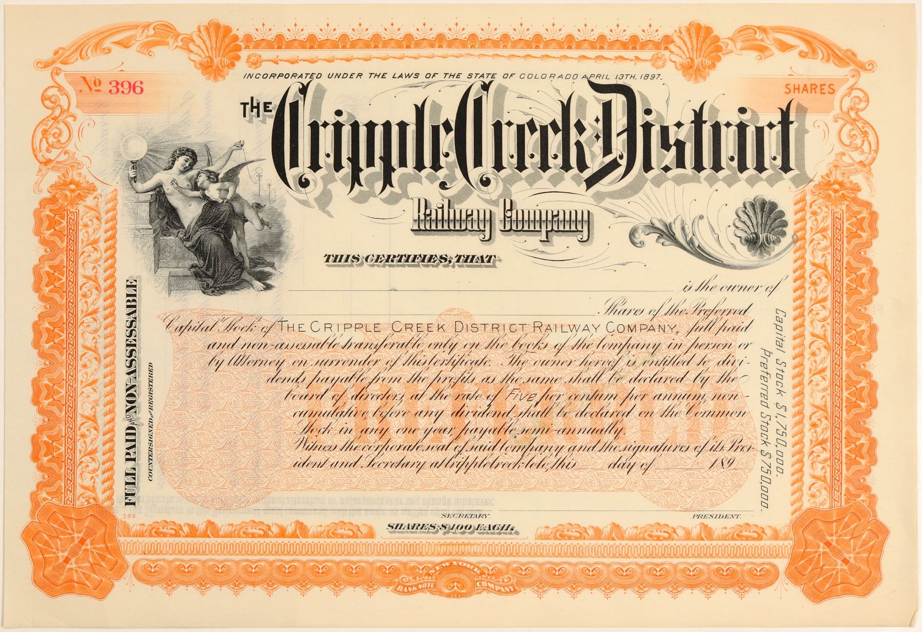 Stock Certificate from the Cripple Creek District Railway Co. Incorporated in 1897 in Colorado. Certificate number 396 issued in 1900. Size 11 by 7.5 inches. In very nice condition - dog ear lower right. Unissued. Bright and colorful. Allegorical vignette. This is a Cripple Creek Interurban rail line.